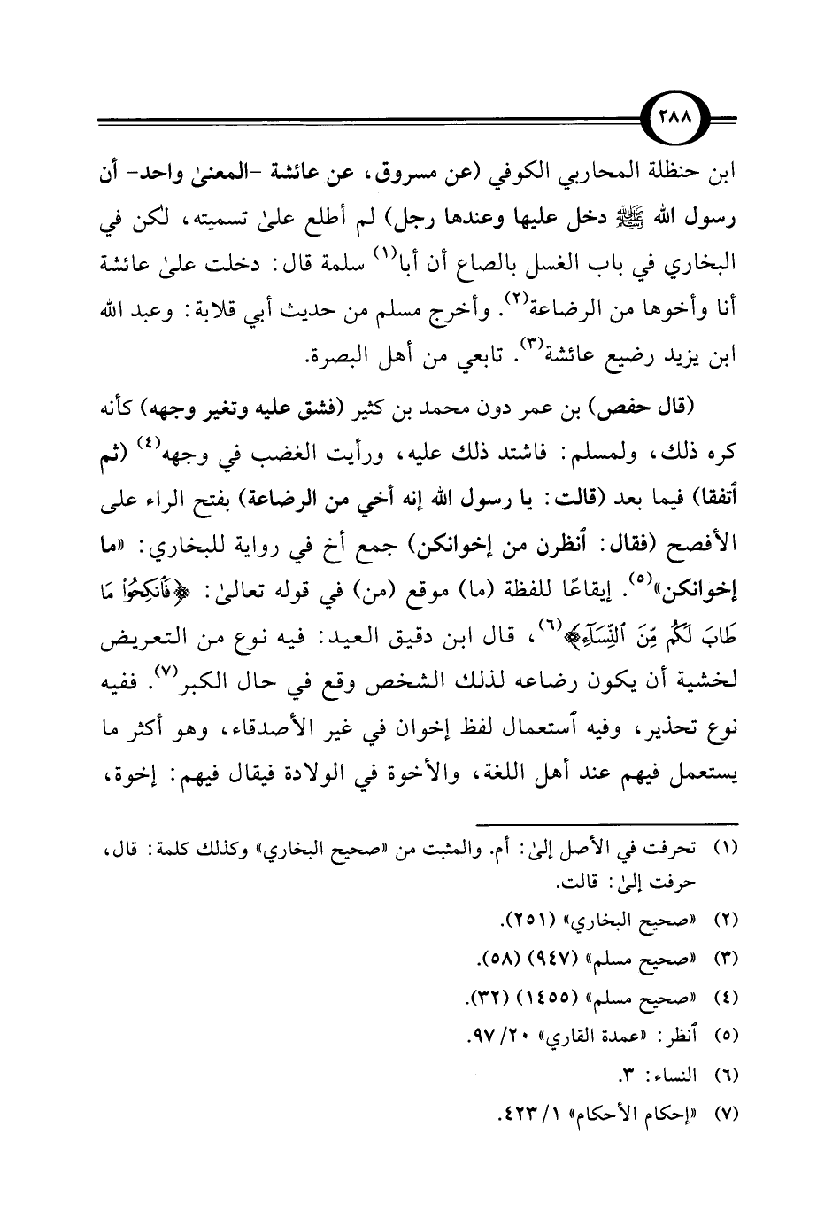 (قال حفص) بن عمر دون محمد بن كثير (فشق عليه وتغير وجهه) كأنه كره ذلك، ولمسلم: فاشتد ذلك عليه، ورأيت الغضب في وجهه (¬4) (ثم اتفقا) فيما بعد (قالت: يا رسول الله إنه أخي من الرضاعة) بفتح الراء على الأفصح (فقال: انظرن من إخوانكن) جمع أخ في رواية للبخاري: "ما إخوانكن" (¬5). إيقاعًا للفظة (ما) موقع (من) في قوله تعالى: {فَانْكِحُوا مَا طَابَ لَكُمْ مِنَ النِّسَاءِ} (¬6)، قال ابن دقيق العيد: فيه نوع من التعريض لخشية أن يكون رضاعه لذلك الشخص وقع في حال الكبر (¬7). ففيه نوع تحذير، وفيه استعمال لفظ إخوان في غير الأصدقاء، وهو أكثر ما يستعمل فيهم عند أهل اللغة، والأخوة في الولادة فيقال فيهم: إخوة،