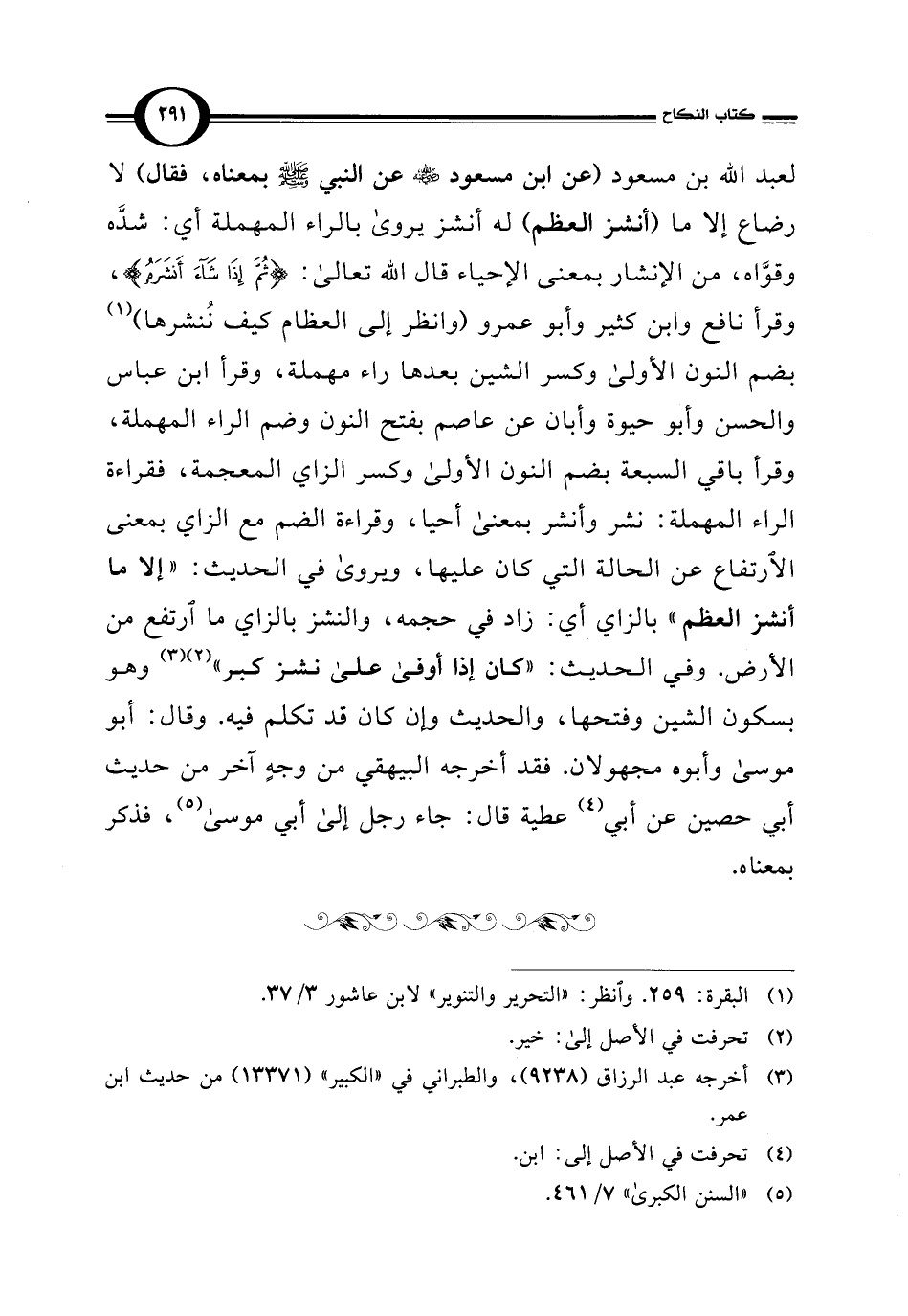 لعبد الله بن مسعود (عن ابن مسعود - رضي الله عنه - عن النبي - صلى الله عليه وسلم - بمعناه، فقال) لا رضاع إلا ما (أنشز العظم) له أنشز يروى بالراء المهملة أي: شدَّه وقوَّاه، من الإنشار بمعنى الإحياء قال الله تعالى: {ثُمَّ إِذَا شَاءَ أَنْشَرَهُ}، وقرأ نافع وابن كثير وأبو عمرو (وانظر إلى العظام كيف نُنشرها) (¬1) بضم النون الأولى وكسر الشين بعدها راء مهملة، وقرأ ابن عباس والحسن وأبو حيوة وأبان عن عاصم بفتح النون وضم الراء المهملة، وقرأ باقي السبعة بضم النون الأولى وكسر الزاي المعجمة، فقراءة الراء المهملة: نشر وأنشر بمعنى أحيا، وقراءة الضم مع الزاي بمعنى الارتفاع عن الحالة التي كان عليها، ويروى في الحديث: "إلا ما أنشز العظم" بالزاي أي: زاد في حجمه، والنشز بالزاي ما ارتفع من الأرض. وفي الحديث: "كان إذا أوفى على نشز كبر" (¬2) (¬3) وهو بسكون الشين وفتحها، والحديث وإن كان قد تكلم فيه. وقال: أبو موسى وأبوه مجهولان. فقد أخرجه البيهقي من وجهٍ آخر من حديث أبي حصين عن أبي (¬4) عطية قال: جاء رجل إلى أبي موسى (¬5)، فذكر بمعناه.