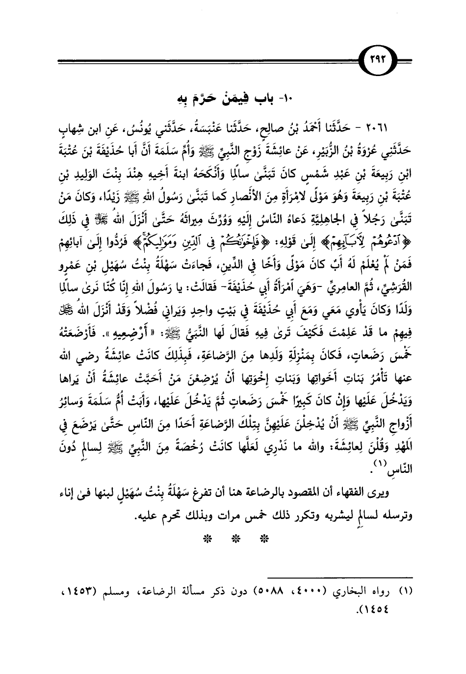2061 - حَدَّثَنا أَحْمَدُ بْنُ صالِحٍ، حَدَّثَنا عَنْبَسَةُ، حَدَّثَني يُونُسُ، عَنِ ابن شِهابٍ حَدَّثَنِي عُرْوَةُ بْنُ الزُّبَيْرِ، عَنْ عَائِشَةَ زَوْجِ النَّبِيِّ - صلى الله عليه وسلم - وأُمِّ سَلَمَةَ أَنَّ أَبا حُذَيْفَةَ بْنَ عُتْبَةَ بْنِ رَبِيعَةَ بْنِ عَبْدِ شَمْسٍ كَانَ تَبَنَّى سالِمًا وَأَنْكَحَهُ ابنةَ أَخِيهِ هِنْدَ بِنْتَ الوَلِيدِ بْنِ عُتْبَةَ بْنِ رَبِيعَةَ وَهُوَ مَوْلًى لامرَأَةٍ مِنَ الأَنْصارِ كَما تَبَنَّى رَسُولُ اللهِ - صلى الله عليه وسلم - زَيْدًا، وَكَانَ مَنْ تَبَنَّى رَجُلًا فِي الجاهِلِيَّةِ دَعاهُ النّاسُ إِلَيْهِ وَوُرِّثَ مِيراثَهُ حَتَّى أَنْزَلَ اللهُ - سبحانه وتعالى - فِي ذَلِكَ {ادْعُوهُمْ لِآبَائِهِمْ} إِلَى قَوْلِهِ: {فَإِخْوَانُكُمْ فِي الدِّينِ وَمَوَالِيكُمْ} فَرُدُّوا إِلَى آبائِهِمْ فَمَنْ لَمْ يُعْلَمْ لَهُ أَبٌ كَانَ مَوْلًى وَأَخًا فِي الدِّينِ، فَجاءَتْ سَهْلَةُ بِنْتُ سُهَيْلِ بْنِ عَمْرٍو القُرَشِيِّ، ثُمَّ العامِريِّ - وَهَيَ امْرَأَةُ أَبِي حُذَيْفَةَ - فَقَالَتْ: يا رَسُولَ اللهِ إِنّا كُنّا نَرى سالِمًا وَلَدًا وَكَانَ يَأْوي مَعَي وَمَعَ أَبِي خذَيْفَةَ فِي بَيْتٍ واحِدٍ وَيَرانِي فُضْلًا وَقَدْ أَنْزَلَ اللهُ - عز وجل - فِيهِمْ ما قَدْ عَلِمْتَ فَكَيْفَ تَرى فِيهِ فَقَالَ لَها النَّبِيُّ - صلى الله عليه وسلم -: "أَرْضِعِيهِ". فَأَرْضَعَتْهُ خَمْسَ رَضَعاتٍ، فَكَانَ بِمَنْزِلَةِ وَلَدِها مِنَ الرَّضاعَةِ، فَبِذَلِكَ كَانَتْ عَائِشَةُ رضي الله عنها تَأْمُرُ بَناتِ أَخَواتِها وَبَناتِ إِخْوَتِها أَنْ يُرْضِعْنَ مَنْ أَحَبَّتْ عَائِشَةُ أَنْ يَراها وَيَدْخُلَ عَلَيْها وَإِنْ كَانَ كَبِيرًا خَمْسَ رَضَعاتٍ ثُمَّ يَدْخُلَ عَلَيْها، وَأَبَتْ أُمُّ سَلَمَةَ وَسائِرُ أَزْواجِ النَّبِيِّ - صلى الله عليه وسلم - أَنْ يُدْخِلْنَ عَلَيْهِنَّ بِتِلْكَ الرَّضاعَةِ أَحَدًا مِنَ النّاسِ حَتَّى يَرْضَعَ فِي المَهْدِ وَقُلْنَ لِعائِشَةَ: والله ما نَدْرِي لَعَلَّها كَانَتْ رُخْصَةً مِنَ النَّبِيِّ - صلى الله عليه وسلم - لِسالِمٍ دُونَ النّاسِ (¬1).