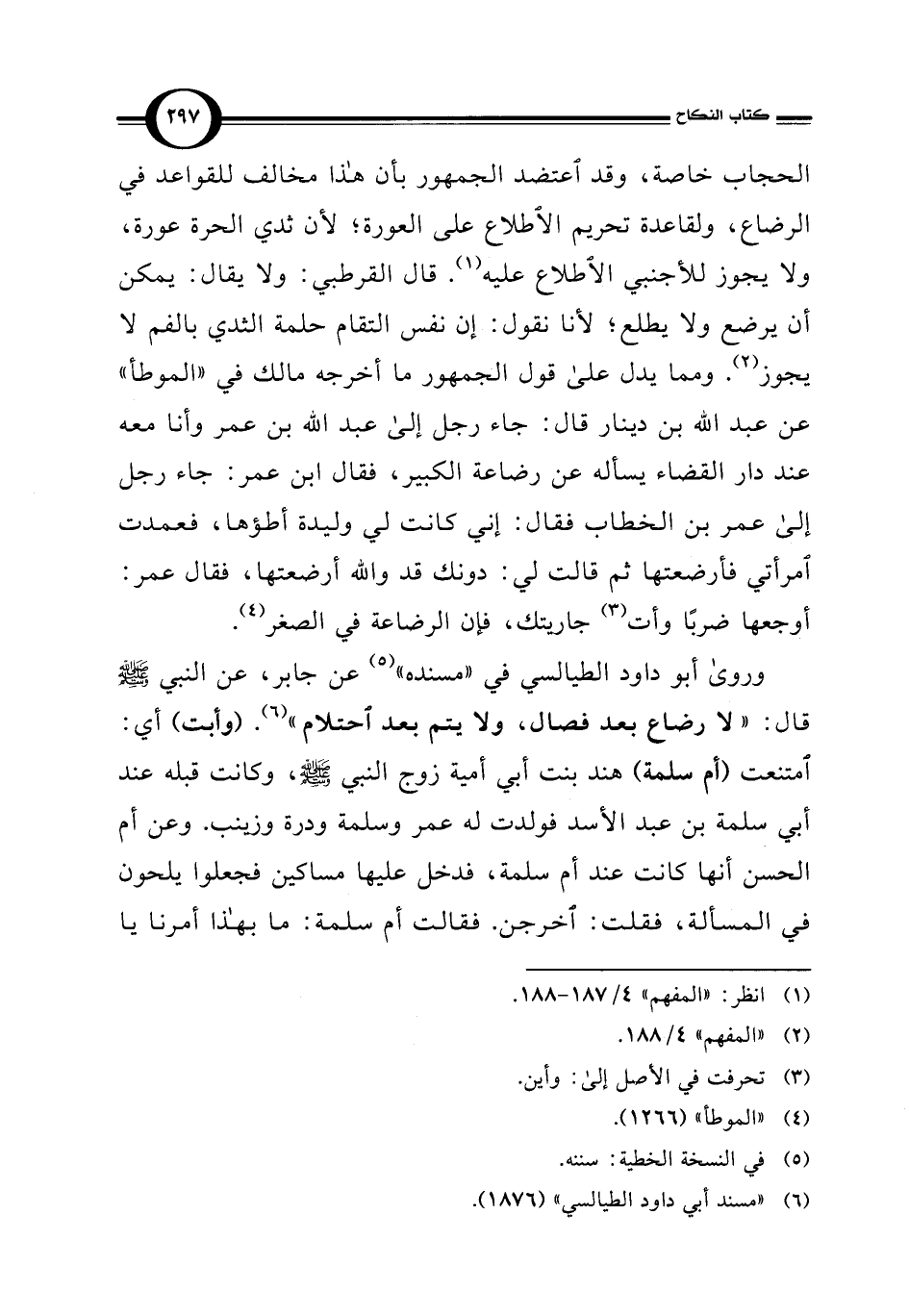 الحجاب خاصة، وقد اعتضد الجمهور بأن هذا مخالف للقواعد في الرضاع، ولقاعدة تحريم الاطلاع على العورة؛ لأن ثدي الحرة عورة، ولا يجوز للأجنبي الاطلاع عليه (¬1). قال القرطبي: ولا يقال: يمكن أن يرضع ولا يطلع؛ لأنا نقول: إن نفس التقام حلمة الثدي بالفم لا يجوز (¬2). ومما يدل على قول الجمهور ما أخرجه مالك في "الموطأ" عن عبد الله بن دينار قال: جاء رجل إلى عبد الله بن عمر وأنا معه عند دار القضاء يسأله عن رضاعة الكبير، فقال ابن عمر: جاء رجل إلى عمر بن الخطاب فقال: إني كانت لي وليدة أطؤها، فعمدت امرأتي فأرضعتها ثم قالت لي: دونك قد والله أرضعتها، فقال عمر: أوجعها ضربًا وأت (¬3) جاريتك، فإن الرضاعة في الصغر (¬4).