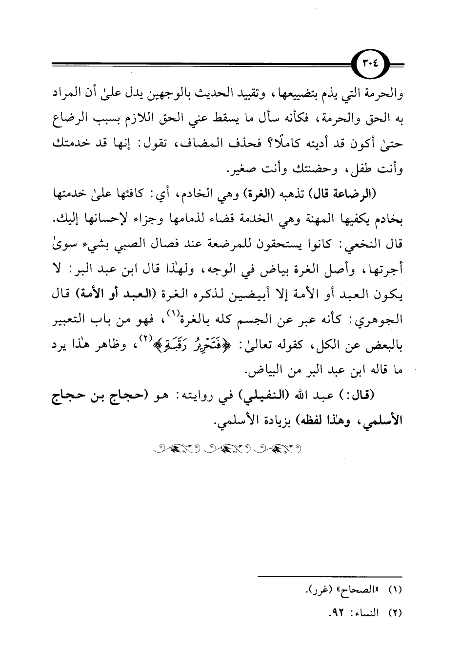 والحرمة التي يذم بتضييعها، وتقييد الحديث بالوجهين يدل على أن المراد به الحق والحرمة، فكأنه سأل ما يسقط عني الحق اللازم بسبب الرضاع حتى أكون قد أديته كاملًا؟ فحذف المضاف، تقول: إنها قد خدمتك وأنت طفل، وحضنتك وأنت صغير.