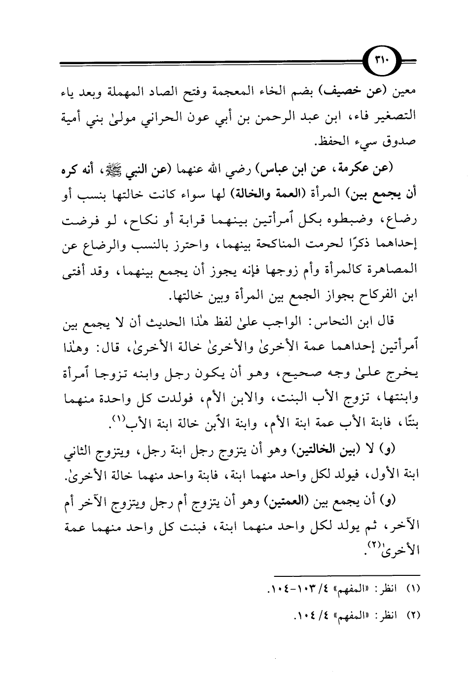 قال ابن النحاس: الواجب على لفظ هذا الحديث أن لا يجمع بين امرأتين إحداهما عمة الأخرى والأخرى خالة الأخرى، قال: وهذا يخرج على وجه صحيح، وهو أن يكون رجل وابنه تزوجا امرأة وابنتها، تزوج الأب البنت، والابن الأم، فولدت كل واحدة منهما بنتًا، فابنة الأب عمة ابنة الأم، وابنة الأبن خالة ابنة الأب (¬1).
