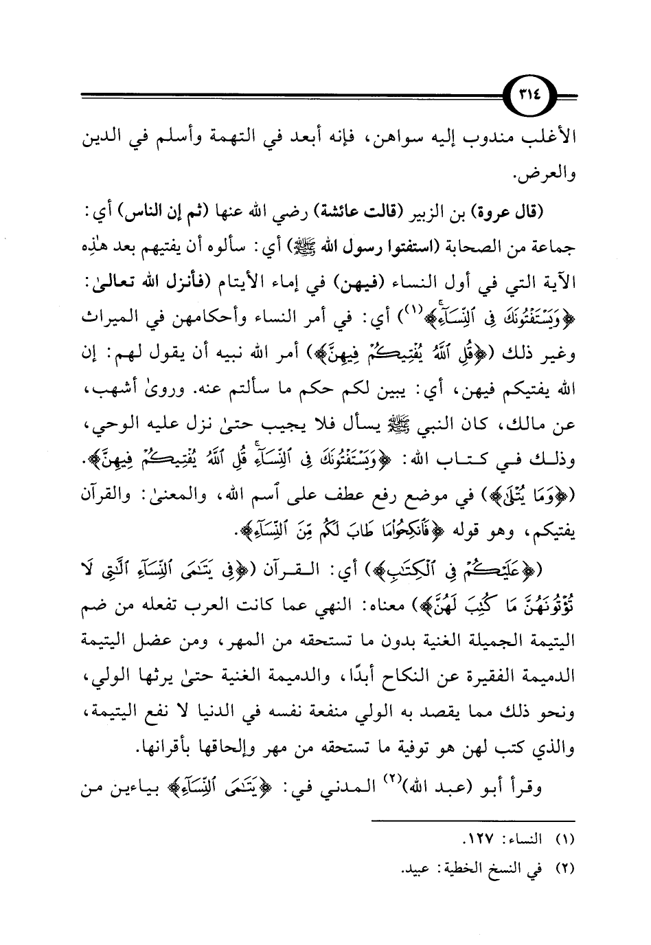 (قال عروة) بن الزبير (قالت عائشة) رضي الله عنها (ثم إن الناس) أي: جماعة من الصحابة (استفتوا رسول الله - صلى الله عليه وسلم -) أي: سألوه أن يفتيهم بعد هذِه الآية التي في أول النساء (فيهن) في إماء الأيتام (فأنزل الله تعالى: {وَيَسْتَفْتُونَكَ فِي النِّسَاءِ}) (¬1) أي: في أمر النساء وأحكامهن في الميراث وغير ذلك ({قُلِ اللَّهُ يُفْتِيكُمْ فِيهِنَّ}) أمر الله نبيه أن يقول لهم: إن الله يفتيكم فيهن، أي: يبين لكم حكم ما سألتم عنه. وروى أشهب، عن مالك، كان النبي - صلى الله عليه وسلم - يسأل فلا يجيب حتى نزل عليه الوحي، وذلك في كتاب الله: {وَيَسْتَفْتُونَكَ فِي النِّسَاءِ قُلِ اللَّهُ يُفْتِيكُمْ فِيهِنَّ}. ({وَمَا يُتْلَى}) في موضع رفع عطف على اسم الله، والمعنى: والقرآن يفتيكم، وهو قوله {فَانْكِحُوا مَا طَابَ لَكُمْ مِنَ النِّسَاءِ}.