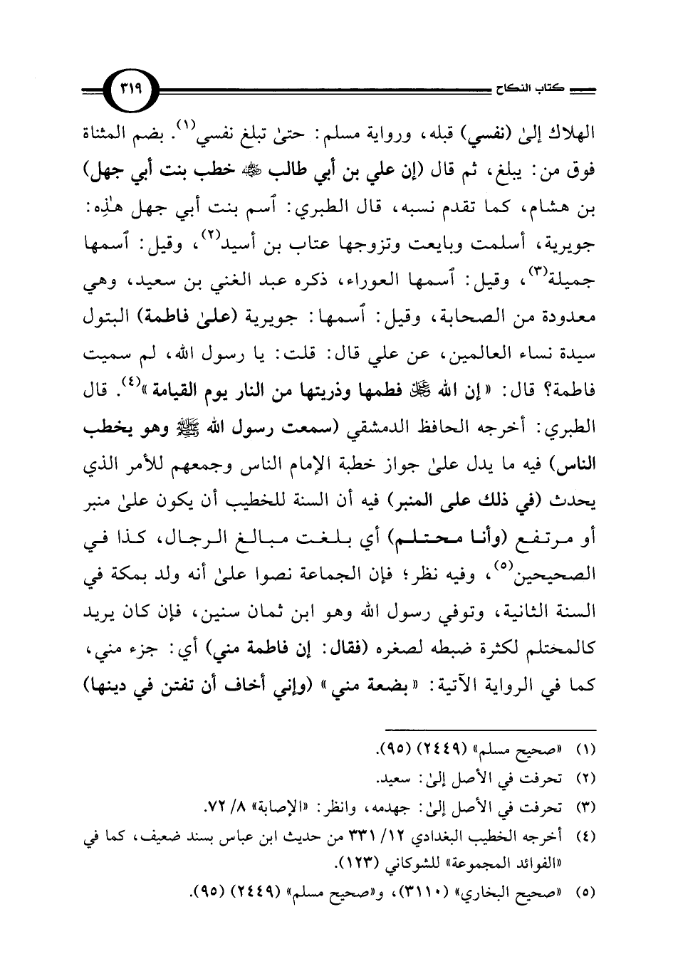 الهلاك إلى (نفسي) قبله، ورواية مسلم: حتى تبلغ نفسي (¬1). بضم المثناة فوق من: يبلغ، ثم قال (إن علي بن أبي طالب - رضي الله عنه - خطب بنت أبي جهل) بن هشام، كما تقدم نسبه، قال الطبري: اسم بنت أبي جهل هذِه: جويرية، أسلمت وبايعت وتزوجها عتاب بن أسيد (¬2)، وقيل: اسمها جميلة (¬3)، وقيل: اسمها العوراء، ذكره عبد الغني بن سعيد، وهي معدودة من الصحابة، وقيل: اسمها: جويرية (على فاطمة) البتول سيدة نساء العالمين، عن علي قال: قلت: يا رسول الله، لم سميت فاطمة؟ قال: "إن الله - عز وجل - فطمها وذريتها من النار يوم القيامة" (¬4). قال الطبري: أخرجه الحافظ الدمشقي (سمعت رسول الله - صلى الله عليه وسلم - وهو يخطب الناس) فيه ما يدل على جواز خطبة الإمام الناس وجمعهم للأمر الذي يحدث (في ذلك على المنبر) فيه أن السنة للخطيب أن يكون على منبر أو مرتفع (وأنا محتلم) أي بلغت مبالغ الرجال، كذا في الصحيحين (¬5)، وفيه نظر؛ فإن الجماعة نصوا على أنه ولد بمكة في السنة الثانية، وتوفي رسول الله وهو ابن ثمان سنين، فإن كان يريد كالمحتلم لكثرة ضبطه لصغره (فقال: إن فاطمة مني) أي: جزء مني، كما في الرواية الآتية: "بضعة مني" (وإني أخاف أن تفتن في دينها)