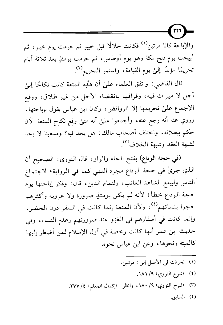 قال القاضي: واتفق العلماء على أن هذِه المتعة كانت نكاحًا إلى أجل لا ميراث فيه، وفراقها بانقضاء الأجل من غير طلاق، ووقع الإجماع على تحريمها إلا الروافض، وكان ابن عباس يقول بإباحتها، وروي عنه أنه رجع عنه، وأجمعوا على أنه متى وقع نكاح المتعة الآن حكم ببطلانه، واختلف أصحاب مالك: هل يحد فيه؟ ومذهبنا لا يحد لشبهة العقد وشبهة الخلاف (¬3).
