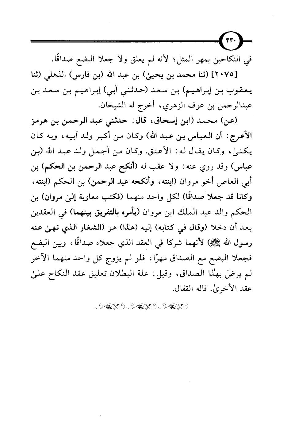 (عن) محمد (ابن إسحاق، قال: حدثني عبد الرحمن بن هرمز الأعرج: أن العباس بن عبد الله) وكان من أكبر ولد أبيه، وبه كان يكنى، وكان يقال له: الأعتق. وكان من أجمل ولد عبد الله (بن عباس) وقد روي عنه: ولا عقب له (أنكح عبد الرحمن بن الحكم) بن أبي العاص أخو مروان (ابنته، وأنكحه عبد الرحمن) بن الحكم (ابنته، وكانا قد جعلا صداقًا) لكل واحد منهما (فكتب معاوية إلى مروان) بن الحكم والد عبد الملك بن مروان (يأمره بالتفريق بينهما) في العقدين بعد أن دخلا (وقال في كتابه) إليه (هذا) هو (الشغار الذي نهى عنه رسول الله - صلى الله عليه وسلم -) لأنهما شركا في العقد الذي جعلاه صداقًا، وبين البضع فجعلا البضع مع الصداق مهرًا، فلو لم يزوج كل واحد منهما الآخر لم يرضَ بهذا الصداق، وقيل: علة البطلان تعليق عقد النكاح على عقد الأخرى. قاله القفال.