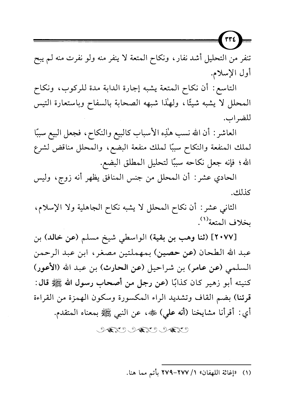 [2077] (ثنا وهب بن بقية) الواسطي شيخ مسلم (عن خالد) بن عبد الله الطحان (عن حصين) بمهملتين مصغر، ابن عبد الرحمن السلمي (عن عامر) بن شراحيل (عن الحارث) بن عبد الله (الأعور) كنيته أبو زهير كان كذابًا (عن رجل من أصحاب رسول الله - صلى الله عليه وسلم - قال: قرئنا) بضم القاف وتشديد الراء المكسورة وسكون الهمزة من القراءة أي: أقرأنا مشايخنا (أنه علي) - رضي الله عنه -، عن النبي - صلى الله عليه وسلم - بمعناه المتقدم.