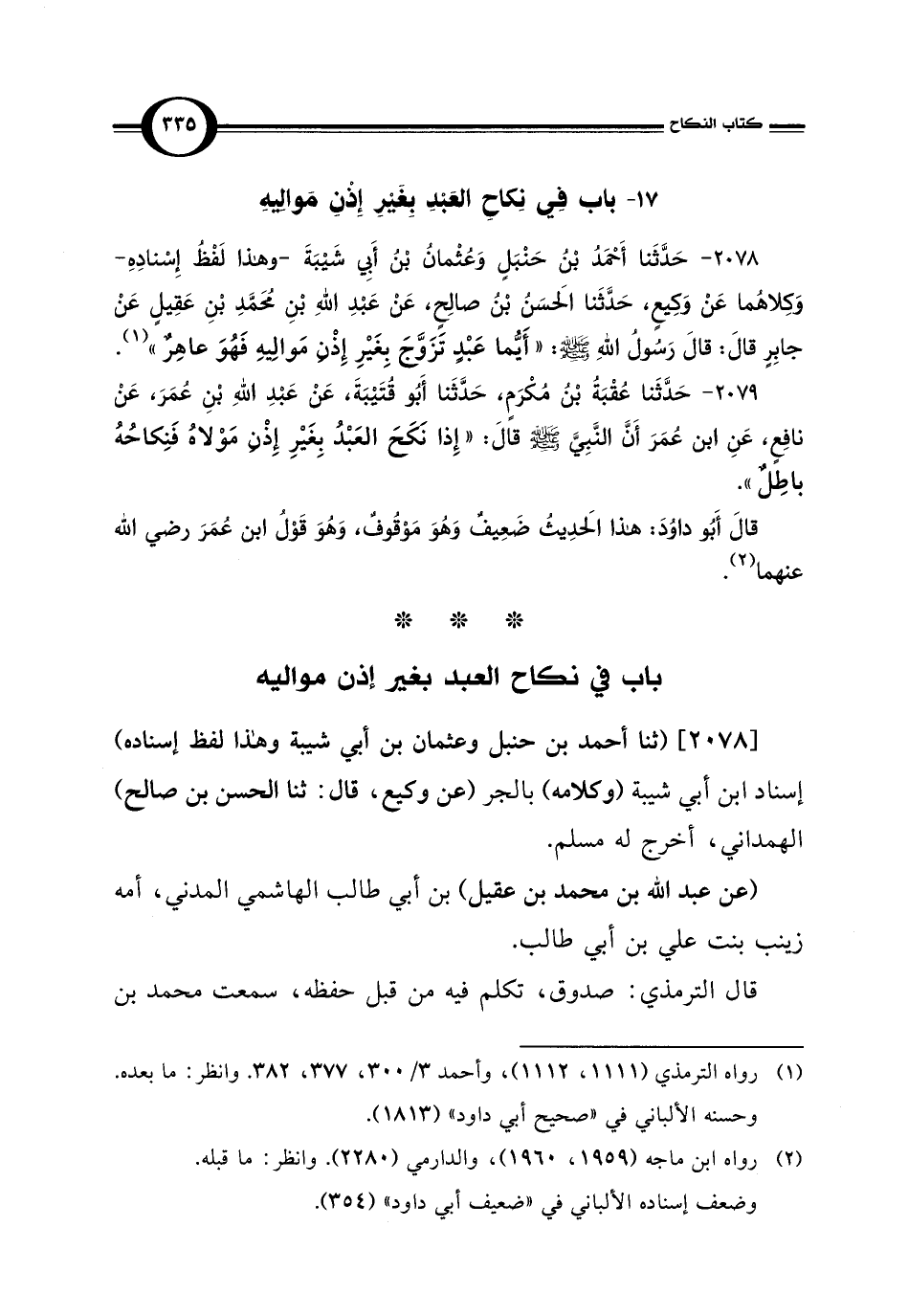 2078 - حَدَّثَنا أَحْمَدُ بْنُ حَنْبَلٍ وَعُثْمانُ بْنُ أَبِي شَيْبَةَ - وهذا لَفْظُ إِسْنادِهِ - وَكِلاهُما عَنْ وَكِيعٍ، حَدَّثَنا الحَسَنُ بْنُ صالِحٍ، عَنْ عَبْدِ اللهِ بْنِ مُحَمَّدِ بْنِ عَقِيلٍ عَنْ جابِرٍ قَالَ: قَالَ رَسُولُ اللهِ - صلى الله عليه وسلم -: "أَيُّما عَبْدٍ تَزَوَّجَ بِغَيْرِ إِذْن مَوالِيهِ فَهُوَ عاهِرٌ" (¬1).