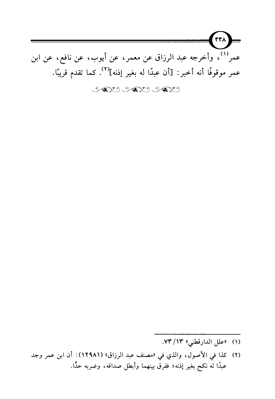 عمر (¬1)، وأخرجه عبد الرزاق عن معمر، عن أيوب، عن نافع، عن ابن عمر موقوفًا أنه أخبر: [أن عبدًا له بغير إذنه] (¬2). كما تقدم قريبًا.