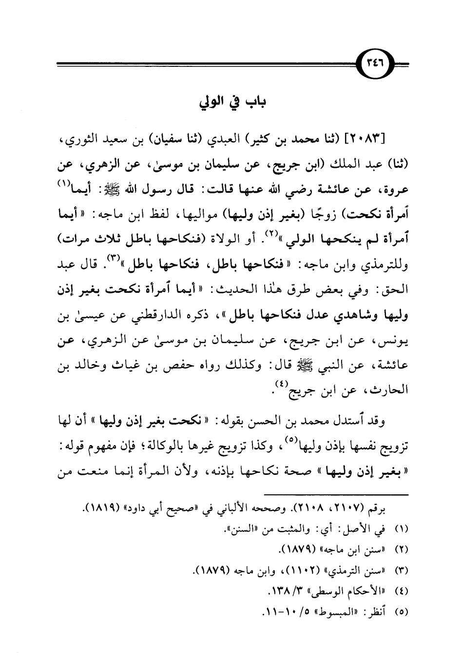 [2083] (ثنا محمد بن كثير) العبدي (ثنا سفيان) بن سعيد الثوري، (ثنا) عبد الملك (ابن جريج، عن سليمان بن موسى، عن الزهري، عن عروة، عن عائشة رضي الله عنها قالت: قال رسول الله - صلى الله عليه وسلم -: أيما (¬1) امرأة نكحت) زوجًا (بغير إذن وليها) مواليها، لفظ ابن ماجه: "أيما امرأة لم ينكحها الولي" (¬2). أو الولاة (فنكاحها باطل ثلاث مرات) وللترمذي وابن ماجه: "فنكاحها باطل، فنكاحها باطل" (¬3). قال عبد الحق: وفي بعض طرق هذا الحديث: "أيما امرأة نكحت بغير إذن وليها وشاهدي عدل فنكاحها باطل"، ذكره الدارقطني عن عيسى بن يونس، عن ابن جريج، عن سليمان بن موسى عن الزهري، عن عائشة، عن النبي - صلى الله عليه وسلم - قال: وكذلك رواه حفص بن غياث وخالد بن الحارث، عن ابن جريج (¬4).