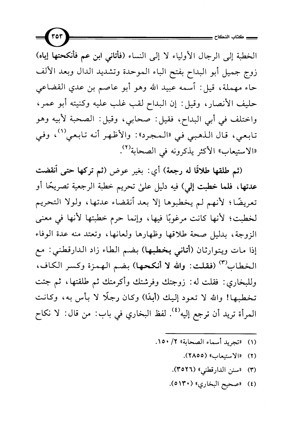 الخطبة إلى الرجال الأولياء لا إلى النساء (فأتاني ابن عم فأنكحتها إياه) زوج جميل أبو البداح بفتح الباء الموحدة وتشديد الدال وبعد الألف حاء مهملة، قيل: اسمه عبيد الله وهو أبو عاصم بن عدي القضاعي حليف الأنصار، وقيل: إن البداح لقب غلب عليه وكنيته أبو عمر، واختلف في أبي البداح، فقيل: صحابي، وقيل: الصحبة لأبيه وهو تابعي، قال الذهبي في "المجرد": والأظهر أنه تابعي (¬1)، وفي "الاستيعاب" الأكثر يذكرونه في الصحابة (¬2).