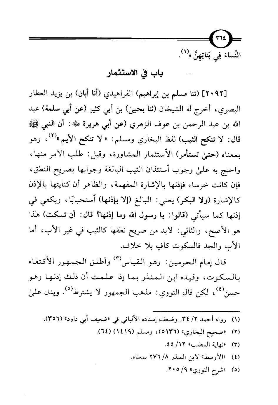 [2092] (ثنا مسلم بن إبراهيم) الفراهيدي (أنا أبان) بن يزيد العطار البصري، أخرج له الشيخان (ثنا يحيى) بن أبي كثير (عن أبي سلمة) عبد الله بن عبد الرحمن بن عوف الزهري (عن أبي هريرة - رضي الله عنه -: أن النبي - صلى الله عليه وسلم - قال: لا تنكح الثيب) لفظ البخاري ومسلم: "لا تنكح الأيم" (¬2)، وهو بمعناه (حتى تستأمر) الاستئمار المشاورة، وقيل: طلب الأمر منها، واحتج به على وجوب استئذان الثيب البالغة وجوابها بصريح النطق، فإن كانت خرساء فإذنها بالإشارة المفهمة، والظاهر أن كنايتها بالإذن كالإشارة (ولا البكر) يعني: البالغ (إلا بإذنها) استحبابًا، ويكفي في إذنها كما سيأتي (قالوا: يا رسول الله وما إذنها؟ قال: أن تسكت) هذا هو الأصح، والثاني: لا بد من صريح نطقها كالثيب في غير الأب، أما الأب والجد فالسكوت كافٍ بلا خلاف.