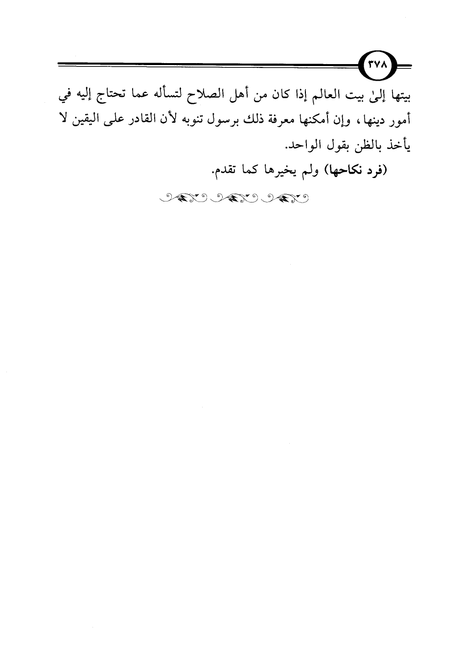 بيتها إلى بيت العالم إذا كان من أهل الصلاح لتسأله عما تحتاج إليه في أمور دينها، وإن أمكنها معرفة ذلك برسول تنوبه لأن القادر على اليقين لا يأخذ بالظن بقول الواحد.