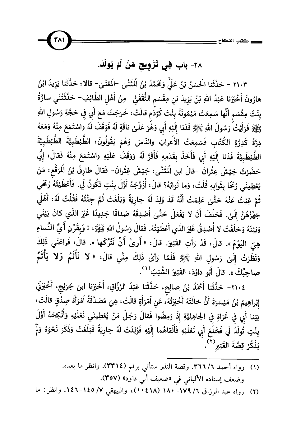 2103 - حَدَّثَنا الحَسَنُ بْنُ عَلَيٍّ وَمُحَمَّدُ بْنُ المُثَنَّى - المَعْنَى - قالا: حَدَّثَنا يَزِيدُ بْنُ هارُونَ أَخْبَرَنا عَبْدُ اللهِ بْنُ يَزِيدَ بْنِ مِقْسَمٍ الثَّقَفَيُّ - مِنْ أَهْلِ الطّائِفِ - حَدَّثَتْنِي سارَّةُ بِنْتُ مِقْسَمٍ أَنَّها سَمِعَتْ مَيْمُونَةَ بِنْتَ كَرْدَمٍ قَالَتْ: خَرَجْتُ مَعَ أَبِي فِي حَجَّةِ رَسُولِ اللهِ - صلى الله عليه وسلم - فَرَأَيْتُ رَسُولَ اللهِ - صلى الله عليه وسلم - فَدَنا إِلَيْهِ أَبِي وَهُوَ عَلَى ناقَةٍ لَهُ فَوَقَفَ لَهُ واسْتَمَعَ مِنْهُ وَمَعَهُ دِرَّةٌ كَدِرَّةِ الكُتّابِ فَسَمِعْتُ الأَعْرابَ والنّاسَ وَهُمْ يَقُولُونَ: الطَّبْطَبِيَّةَ الطَّبْطَبِيَّةَ الطَّبْطَبِيَّةَ فَدَنا إِلَيْهِ أَبِي فَأَخَذَ بِقَدَمِهِ فَأَقَرَّ لَهُ وَوَقَفَ عَلَيْهِ واسْتَمَعَ مِنْهُ فَقَالَ: إِنَّي حَضَرْتُ جَيْشَ عِثْرانَ - قَالَ ابن المُثَنَّى: جَيْشَ غِثْرانَ - فَقَالَ طارِقُ بْنُ المُرَقَّعِ: مَنْ يُعْطِينِي رُمْحًا بِثَوابِهِ قُلْتُ: وَما ثَوابُهُ؟ قَالَ: أُزَوِّجُهُ أَوَّلَ بِنْتٍ تَكُونُ لِي. فَأَعْطَيْتُهُ رُمْحِي ثُمَّ غِبْتُ عَنْهُ حَتَّى عَلِمْتُ أَنَّهُ قَدْ وُلِدَ لَهُ جارِيَةٌ وَبَلَغَتْ ثُمَّ جِئْتُهُ فَقُلْتُ لَهُ: أَهْلِي جَهِّزْهُنَّ إِلَى. فَحَلَفَ أَنْ لا يَفْعَلَ حَتَّى أُصْدِقَهُ صَداقًا جَدِيدًا غَيْرَ الذِي كَانَ بَيْنِي وَبَيْنَهُ وَحَلَفْتُ لا أُصْدِقُ غَيْرَ الذِي أَعْطَيْتُهُ. فَقَالَ رَسُولُ اللهِ - صلى الله عليه وسلم -: "وَبِقَرْنِ أَيِّ النِّساءِ هِيَ اليَوْمَ". قَالَ: قَدْ رَأَتِ القَتِيرَ. قَالَ: "أَرى أَنْ تَتْرُكَها". قَالَ: فَراعَنِي ذَلِكَ وَنَظَرْتُ إِلَى رَسُولِ اللهِ - صلى الله عليه وسلم - فَلَمّا رَأى ذَلِكَ مِنِّي قَالَ: "لا تَأْثَمُ وَلا يَأْثَمُ صاحِبُكَ". قَالَ أَبُو دَاوُدَ: القَتِيرُ الشَّيْبُ (¬1).