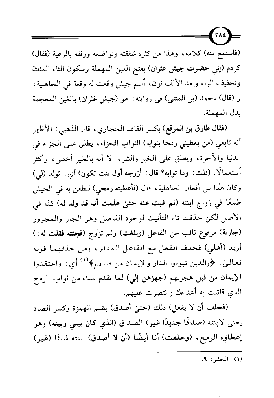 (فقال طارق بن المرقع) بكسر القاف الحجازي، قال الذهبي: الأظهر أنه تابعي (من يعطيني رمحًا بثوابه) الثواب الجزاء، يطلق على الجزاء في الدنيا والآخرة، ويطلق على الخير والشر، إلا أنه بالخير أخص، وأكثر استعمالًا. (قلت: وما ثوابه؟ قال: أزوجه أول بنت تكون) أي: تولد (لي) وكان هذا من أفعال الجاهلية، قال (فأعطيته رمحي) ليطعن به في الجيش طمعًا في زواج ابنته (ثم غبت عنه حتى علمت أنه قد ولد له) كذا في الأصل لكن حذفت تاء التأنيث لوجود الفاصل وهو الجار والمجرور (جارية) مرفوع نائب عن الفاعل (وبلغت) ولم تزوج (فجئته فقلت له: ) أريد (أهلي) فحذف الفعل مع الفاعل المقدر، ومن حذفهما قوله تعالى: {وَالَّذِينَ تَبَوَّءُوا الدَّارَ وَالْإِيمَانَ مِنْ قَبْلِهِمْ} (¬1) أي: واعتقدوا الإيمان من قبل هجرتهم (جهزهن إلي) لما تقدم منك من ثواب الرمح الذي قاتلت به أعداءك وانتصرت عليهم.