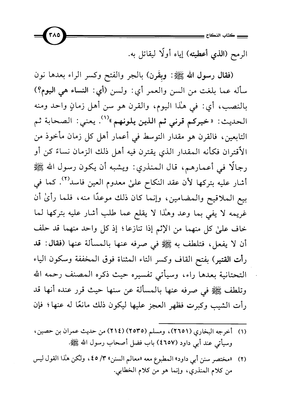 (فقال رسول الله - صلى الله عليه وسلم -: وبِقَرن) بالجر والفتح وكسر الراء بعدها نون سأله عما بلغت من السن والعمر أي: ولسن (أي: النساء هي اليوم؟ ) بالنصب، أي: في هذا اليوم، والقرن هو سن أهل زمانٍ واحد ومنه الحديث: "خيركم قرني ثم الذين يلونهم" (¬1). يعني: الصحابة ثم التابعين، فالقرن هو مقدار التوسط في أعمار أهل كل زمان مأخوذ من الاقتران فكأنه المقدار الذي يقترن فيه أهل ذلك الزمان نساءً كن أو رجالًا في أعمارهم، قال المنذري: ويشبه أن يكون رسول الله - صلى الله عليه وسلم - أشار عليه بتركها لأن عقد النكاح على معدوم العين فاسد (¬2). كما في بيع الملاقيح والمضامين، وإنما كان ذلك موعدًا منه، فلما رأى أن غريمه لا يفي بما وعد وهذا لا يقلع عما طلب أشار عليه بتركها لما خاف على كل منهما من الإثم إذا تنازعا؛ إذ كل واحد منهما قد حلف أن لا يفعل، فتلطف به - صلى الله عليه وسلم - في صرفه عنها بالمسألة عنها (فقال: قد رأت القتير) بفتح القاف وكسر التاء المثناة فوق المخففة وسكون الياء التحتانية بعدها راء، وسيأتي تفسيره حيث ذكره المصنف رحمه الله وتلطف - صلى الله عليه وسلم - في صرفه عنها بالمسألة عن سنها حيث قرر عنده أنها قد رأت الشيب وكبرت فظهر العجز عليها ليكون ذلك مانعًا له عنها؛ فإن