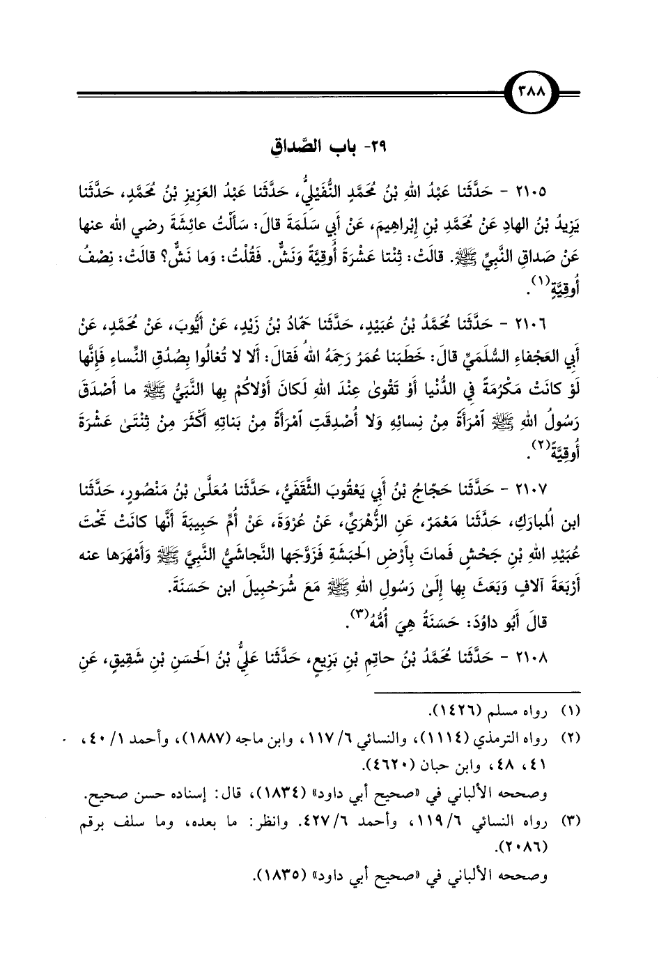 2106 - حَدَّثَنا مُحَمَّدُ بْنُ عُبَيْدٍ، حَدَّثَنا حَمّادُ بْنُ زَيْدٍ، عَنْ أَيُّوبَ، عَنْ مُحَمَّدٍ، عَنْ أَبِي العَجْفاءِ السُّلَمِيِّ قَالَ: خَطَبَنا عُمَرُ رَحِمَهُ اللهُ فَقَالَ: أَلا لا تُغالُوا بِصُدُقِ النِّساءِ فَإِنَّها لَوْ كَانَتْ مَكْرُمَةً فِي الدُّنْيا أَوْ تَقْوى عِنْدَ اللهِ لَكانَ أَوْلاكُمْ بِها النَّبِيُّ - صلى الله عليه وسلم - ما أَصْدَقَ رَسُولُ اللهِ - صلى الله عليه وسلم - امْرَأَةً مِنْ نِسائِهِ وَلا أُصْدِقَتِ امْرَأَةٌ مِنْ بَناتِهِ أَكْثَرَ مِنْ ثِنْتَى عَشْرَةَ أُوقِيَّةً (¬2).
