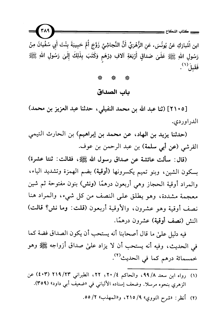 (قال: سألت عائشة عن صداق رسول الله - صلى الله عليه وسلم -، فقالت: ثنتا عشرة) بسكون الشين، وبنو تميم يكسرونها (أوقية) بضم الهمزة وتشديد الياء، والمراد أوقية الحجاز وهي أربعون درهمًا (ونش) بنون مفتوحة ثم شين معجمة مشددة، وهو يطلق على النصف من كل شيء، والمراد هنا نصف أوقية وهو عشرون، والأوقية أربعون (قلت: وما نش؟ قالت) النش (نصف أوقية) عشرون درهمًا.
