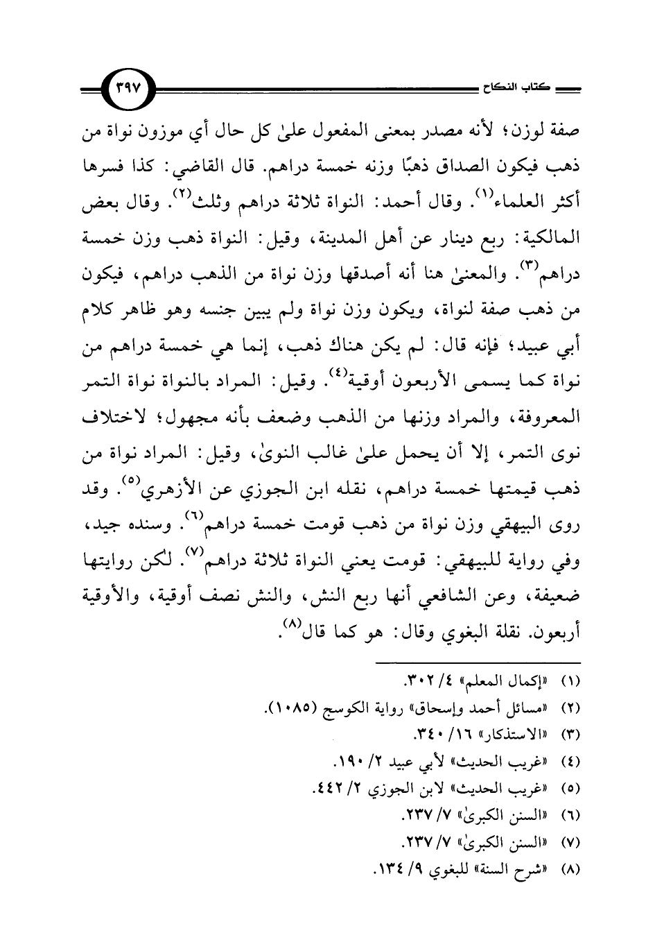 صفة لوزن؛ لأنه مصدر بمعنى المفعول على كل حال أي موزون نواة من ذهب فيكون الصداق ذهبًا وزنه خمسة دراهم. قال القاضي: كذا فسرها أكثر العلماء (¬1). وقال أحمد: النواة ثلاثة دراهم وثلث (¬2). وقال بعض المالكية: ربع دينار عن أهل المدينة، وقيل: النواة ذهب وزن خمسة دراهم (¬3). والمعنى هنا أنه أصدقها وزن نواة من الذهب دراهم، فيكون من ذهب صفة لنواة، ويكون وزن نواة ولم يبين جنسه وهو ظاهر كلام أبي عبيد؛ فإنه قال: لم يكن هناك ذهب، إنما هي خمسة دراهم من نواة كما يسمى الأربعون أوقية (¬4). وقيل: المراد بالنواة نواة التمر المعروفة، والمراد وزنها من الذهب وضعف بأنه مجهول؛ لاختلاف نوى التمر، إلا أن يحمل على غالب النوى، وقيل: المراد نواة من ذهب قيمتها خمسة دراهم، نقله ابن الجوزي عن الأزهري (¬5). وقد روى البيهقي وزن نواة من ذهب قومت خمسة دراهم (¬6). وسنده جيد، وفي رواية للبيهقي: قومت يعني النواة ثلاثة دراهم (¬7). لكن روايتها ضعيفة، وعن الشافعي أنها ربع النش، والنش نصف أوقية، والأوقية أربعون. نقلة البغوي وقال: هو كما قال (¬8).