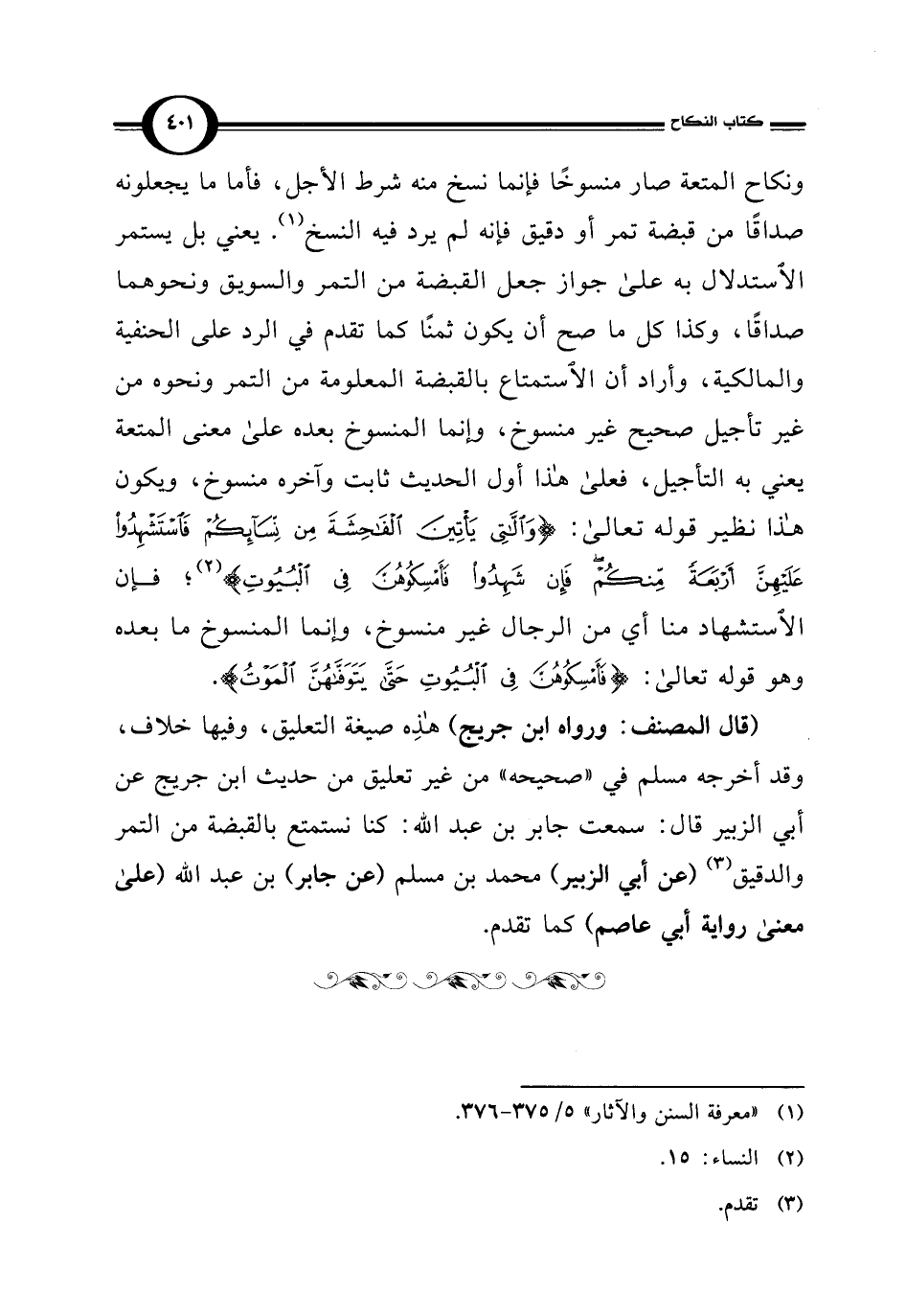 ونكاح المتعة صار منسوخًا فإنما نسخ منه شرط الأجل، فأما ما يجعلونه صداقًا من قبضة تمر أو دقيق فإنه لم يرد فيه النسخ (¬1). يعني بل يستمر الاستدلال به على جواز جعل القبضة من التمر والسويق ونحوهما صداقًا، وكذا كل ما صح أن يكون ثمنًا كما تقدم في الرد على الحنفية والمالكية، وأراد أن الاستمتاع بالقبضة المعلومة من التمر ونحوه من غير تأجيل صحيح غير منسوخ، وإنما المنسوخ بعده على معنى المتعة يعني به التأجيل، فعلى هذا أول الحديث ثابت وآخره منسوخ، ويكون هذا نظير قوله تعالى: {وَاللَّاتِي يَأْتِينَ الْفَاحِشَةَ مِنْ نِسَائِكُمْ فَاسْتَشْهِدُوا عَلَيْهِنَّ أَرْبَعَةً مِنْكُمْ فَإِنْ شَهِدُوا فَأَمْسِكُوهُنَّ فِي الْبُيُوتِ} (¬2)؛ فإن الاستشهاد منا أي من الرجال غير منسوخ، وإنما المنسوخ ما بعده وهو قوله تعالى: {فَأَمْسِكُوهُنَّ فِي الْبُيُوتِ حَتَّى يَتَوَفَّاهُنَّ الْمَوْتُ}.