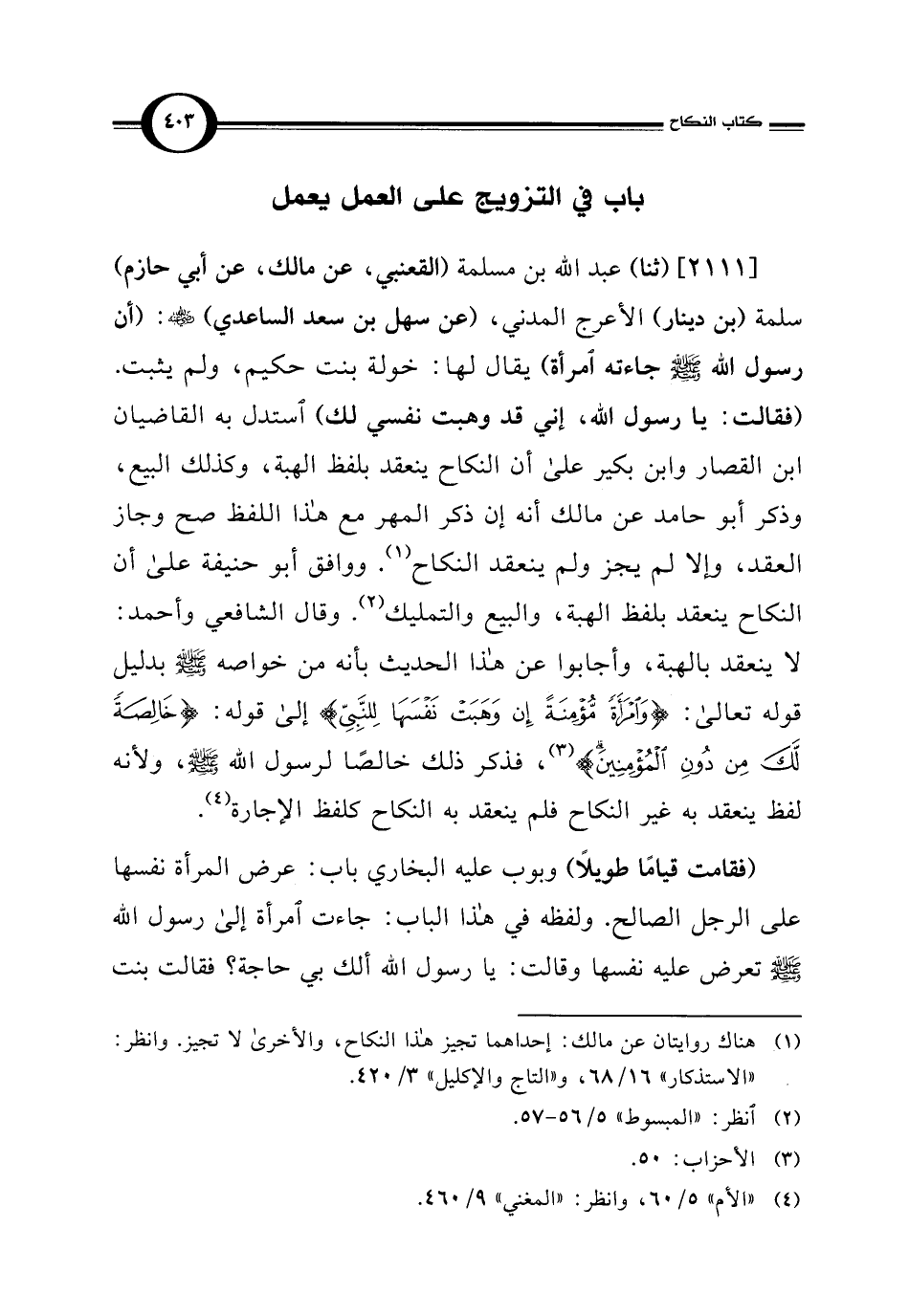 [2111] (ثنا) عبد الله بن مسلمة (القعنبي، عن مالك، عن أبي حازم) سلمة (بن دينار) الأعرج المدني، (عن سهل بن سعد الساعدي) - رضي الله عنه -: (أن رسول الله - صلى الله عليه وسلم - جاءته امرأة) يقال لها: خولة بنت حكيم، ولم يثبت. (فقالت: يا رسول الله، إني قد وهبت نفسي لك) استدل به القاضيان ابن القصار وابن بكير على أن النكاح ينعقد بلفظ الهبة، وكذلك البيع، وذكر أبو حامد عن مالك أنه إن ذكر المهر مع هذا اللفظ صح وجاز العقد، وإلا لم يجز ولم ينعقد النكاح (¬1). ووافق أبو حنيفة على أن النكاح ينعقد بلفظ الهبة، والبيع والتمليك (¬2). وقال الشافعي وأحمد: لا ينعقد بالهبة، وأجابوا عن هذا الحديث بأنه من خواصه - صلى الله عليه وسلم - بدليل قوله تعالى: {وَامْرَأَةً مُؤْمِنَةً إِنْ وَهَبَتْ نَفْسَهَا لِلنَّبِيِّ} إلى قوله: {خَالِصَةً لَكَ مِنْ دُونِ الْمُؤْمِنِينَ} (¬3)، فذكر ذلك خالصًا لرسول الله - صلى الله عليه وسلم -، ولأنه لفظ ينعقد به غير النكاح فلم ينعقد به النكاح كلفظ الإجارة (¬4).