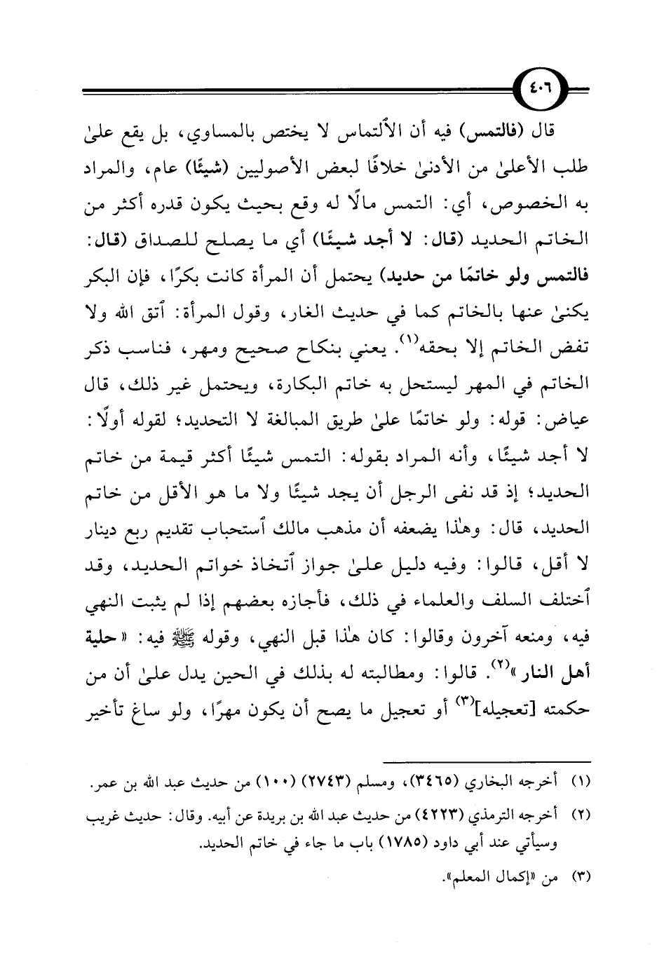 قال (فالتمس) فيه أن الالتماس لا يختص بالمساوي، بل يقع على طلب الأعلى من الأدنى خلافًا لبعض الأصوليين (شيئًا) عام، والمراد به الخصوص، أي: التمس مالًا له وقع بحيث يكون قدره أكثر من الخاتم الحديد (قال: لا أجد شيئًا) أي ما يصلح للصداق (قال: فالتمس ولو خاتمًا من حديد) يحتمل أن المرأة كانت بكرًا، فإن البكر يكنى عنها بالخاتم كما في حديث الغار، وقول المرأة: اتق الله ولا تفض الخاتم إلا بحقه (¬1). يعني بنكاح صحيح ومهر، فناسب ذكر الخاتم في المهر ليستحل به خاتم البكارة، ويحتمل غير ذلك، قال عياض: قوله: ولو خاتمًا على طريق المبالغة لا التحديد؛ لقوله أولًا: لا أجد شيئًا، وأنه المراد بقوله: التمس شيئًا أكثر قيمة من خاتم الحديد؛ إذ قد نفى الرجل أن يجد شيئًا ولا ما هو الأقل من خاتم الحديد، قال: وهذا يضعفه أن مذهب مالك استحباب تقديم ربع دينار لا أقل، قالوا: وفيه دليل على جواز اتخاذ خواتم الحديد، وقد اختلف السلف والعلماء في ذلك، فأجازه بعضهم إذا لم يثبت النهي فيه، ومنعه آخرون وقالوا: كان هذا قبل النهي، وقوله - صلى الله عليه وسلم - فيه: "حلية أهل النار" (¬2). قالوا: ومطالبته له بذلك في الحين يدل على أن من حكمته [تعجيله] (¬3) أو تعجيل ما يصح أن يكون مهرًا، ولو ساغ تأخير