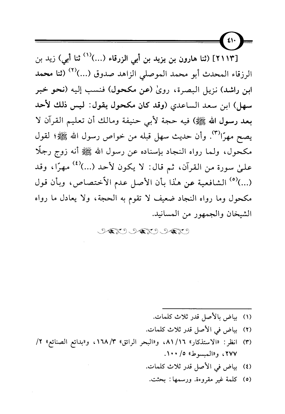 [2113] (ثنا هارون بن يزيد بن أبي الزرقاء (. . .) (¬1) ثنا أبي) زيد بن الرزقاء المحدث أبو محمد الموصلي الزاهد صدوق (. . .) (¬2) (ثنا محمد بن راشد) نزيل البصرة، روى (عن مكحول) فنسب إليه (نحو خبر سهل) ابن سعد الساعدي (وقد كان مكحول يقول: ليس ذلك لأحد بعد رسول الله - صلى الله عليه وسلم -) فيه حجة لأبي حنيفة ومالك أن تعليم القرآن لا يصح مهرًا (¬3). وأن حديث سهل قبله من خواص رسول الله - صلى الله عليه وسلم -؛ لقول مكحول، ولما رواه النجاد بإسناده عن رسول الله - صلى الله عليه وسلم - أنه زوج رجلًا على سورة من القرآن، ثم قال: لا يكون لأحد (. . .) (¬4) مهرًا، وقد (. . .) (¬5) الشافعية عن هذا بأن الأصل عدم الاختصاص، وبأن قول مكحول وما رواه النجاد ضعيف لا تقوم به الحجة، ولا يعادل ما رواه الشيخان والجمهور من المسانيد.