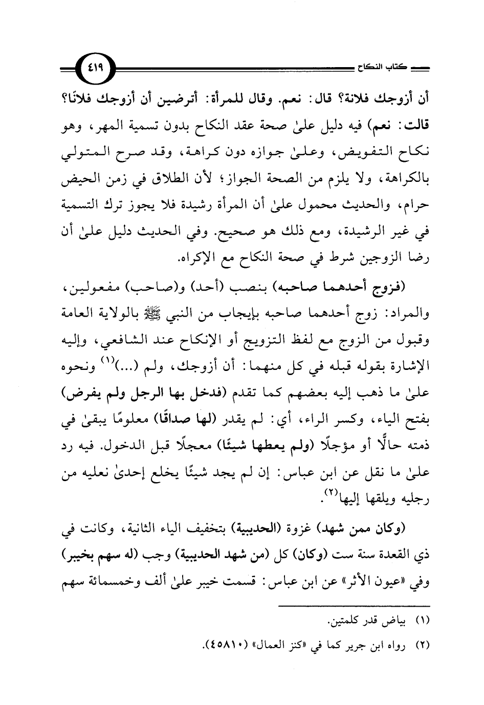 أن أزوجك فلانة؟ قال: نعم. وقال للمرأة: أترضين أن أزوجك فلانًا؟ قالت: نعم) فيه دليل على صحة عقد النكاح بدون تسمية المهر، وهو نكاح التفويض، وعلى جوازه دون كراهة، وقد صرح المتولي بالكراهة، ولا يلزم من الصحة الجواز؛ لأن الطلاق في زمن الحيض حرام، والحديث محمول على أن المرأة رشيدة فلا يجوز ترك التسمية في غير الرشيدة، ومع ذلك هو صحيح. وفي الحديث دليل على أن رضا الزوجين شرط في صحة النكاح مع الإكراه.