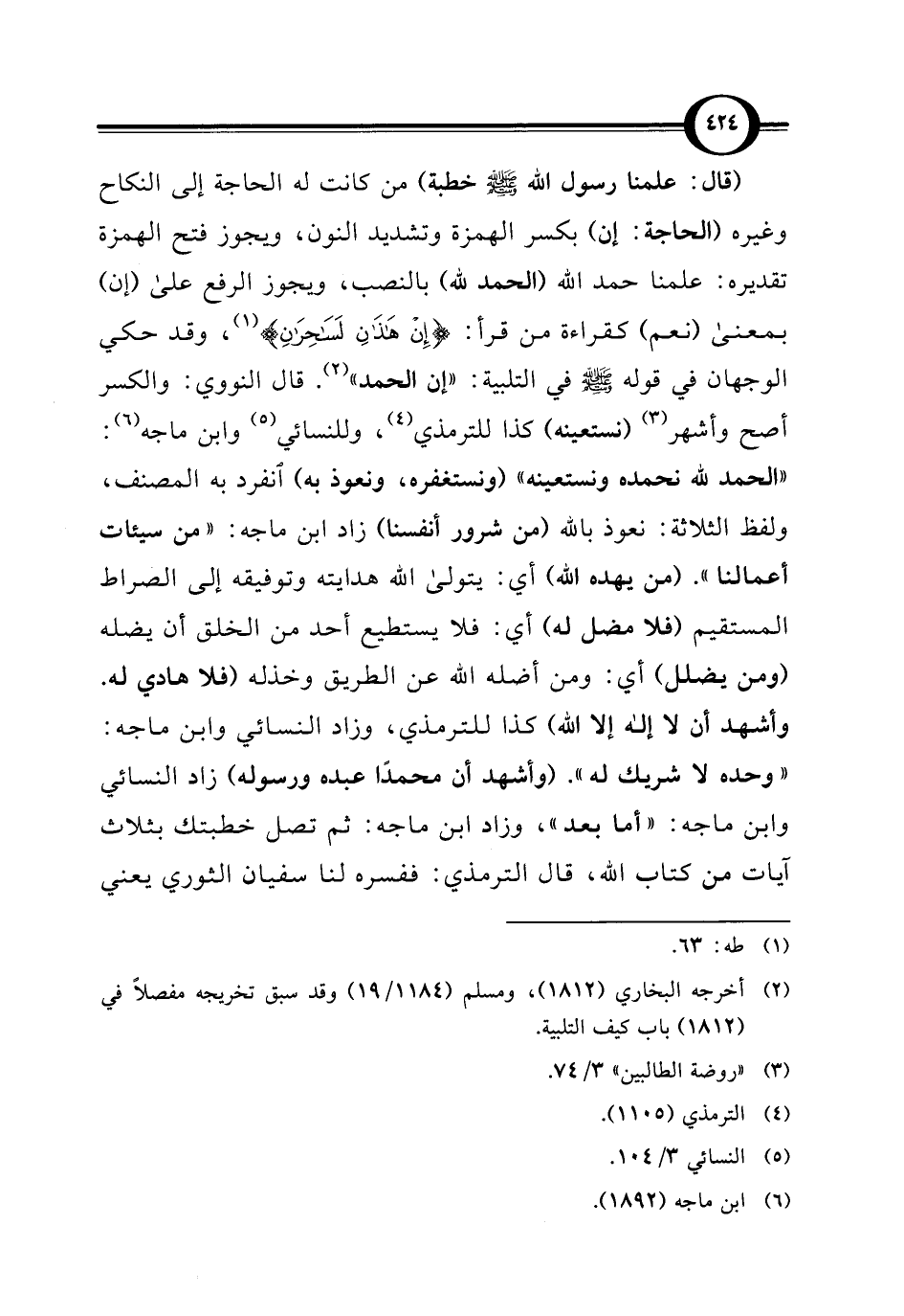 (قال: علمنا رسول الله - صلى الله عليه وسلم - خطبة) من كانت له الحاجة إلى النكاح وغيره (الحاجة: إن) بكسر الهمزة وتشديد النون، ويجوز فتح الهمزة تقديره: علمنا حمد الله (الحمد لله) بالنصب، ويجوز الرفع على (إن) بمعنى (نعم) كقراءة من قرأ: {إِنْ هَذَانِ لَسَاحِرَانِ} (¬1)، وقد حكي الوجهان في قوله - صلى الله عليه وسلم - في التلبية: "إن الحمد" (¬2). قال النووي: والكسر أصح وأشهر (¬3) (نستعينه) كذا للترمذي (¬4)، وللنسائي (¬5) وابن ماجه (¬6): "الحمد لله نحمده ونستعينه" (ونستغفره، ونعوذ به) انفرد به المصنف، ولفظ الثلاثة: نعوذ بالله (من شرور أنفسنا) زاد ابن ماجه: "من سيئات أعمالنا". (من يهده الله) أي: يتولى الله هدايته وتوفيقه إلى الصراط المستقيم (فلا مضل له) أي: فلا يستطيع أحد من الخلق أن يضله (ومن يضلل) أي: ومن أضله الله عن الطريق وخذله (فلا هادي له. وأشهد أن لا إله إلا الله) كذا للترمذي، وزاد النسائي وابن ماجه: "وحده لا شريك له". (وأشهد أن محمدًا عبده ورسوله) زاد النسائي وابن ماجه: "أما بعد"، وزاد ابن ماجه: ثم تصل خطبتك بثلاث آيات من كتاب الله، قال الترمذي: ففسره لنا سفيان الثوري يعني
