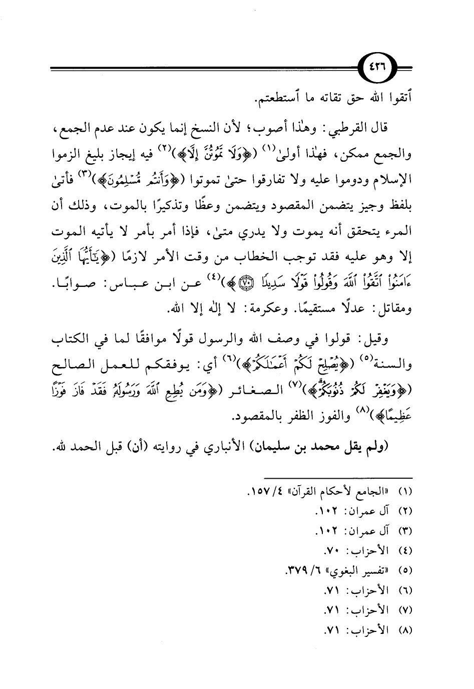 قال القرطبي: وهذا أصوب؛ لأن النسخ إنما يكون عند عدم الجمع، والجمع ممكن، فهذا أولى (¬1) ({وَلَا تَمُوتُنَّ إِلَّا}) (¬2) فيه إيجاز بليغ الزموا الإسلام ودوموا عليه ولا تفارقوا حتى تموتوا ({وَأَنْتُمْ مُسْلِمُونَ}) (¬3) فأتى بلفظ وجيز يتضمن المقصود ويتضمن وعظًا وتذكيرًا بالموت، وذلك أن المرء يتحقق أنه يموت ولا يدري متى، فإذا أمر بأمر لا يأتيه الموت إلا وهو عليه فقد توجب الخطاب من وقت الأمر لازمًا ({يَاأَيُّهَا الَّذِينَ آمَنُوا اتَّقُوا اللَّهَ وَقُولُوا قَوْلًا سَدِيدًا (70)}) (¬4) عن ابن عباس: صوابًا. ومقاتل: عدلًا مستقيمًا. وعكرمة: لا إله إلا الله.