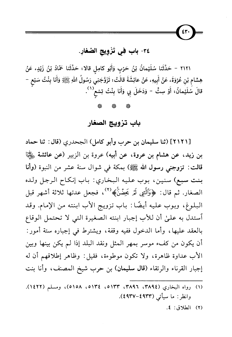 [2121] (ثنا سليمان بن حرب وأبو كامل) الجحدري (قال: ثنا حماد بن زيد، عن هشام بن عروة، عن أبيه) عروة بن الزبير (عن عائشة - رضي الله عنها - قالت: تزوجني رسول الله - صلى الله عليه وسلم -) بمكة في شوال سنة عشر من النبوة (وأنا بنت سبع) سنين، بوب عليه البخاري: باب إنكاح الرجل ولده الصغار. ثم قال: {وَاللَّائِي لَمْ يَحِضْنَ} (¬2)، فجعل عدتها ثلاثة أشهر قبل البلوغ، وبوب عليه أيضًا: باب تزويج الأب ابنته من الإمام. وقد استدل به على أن للأب إجبار ابنته الصغيرة التي لا تحتمل الوقاع بالعقد عليها، وأما الدخول ففيه وقفة، ويشترط في إجباره ستة أمور: أن يكون من كفء موسر بمهر المثل ونقد البلد إذا لم يكن بينها وبين الأب عداوة ظاهرة، ولا تكون موطوءة، فقيل: وظاهر إطلاقهم أن له إجبار القرناء والرتقاء (قال سليمان) بن حرب شيخ المصنف، وأنا بنت