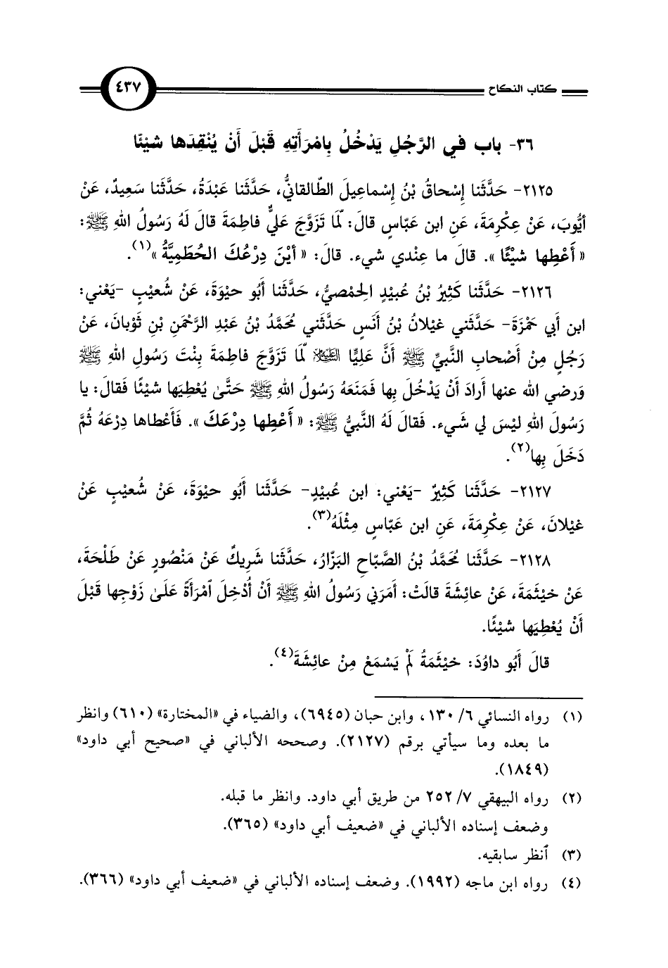 2126 - حَدَّثَنا كَثِيرُ بْنُ عُبيْدٍ الحِمْصيُّ، حَدَّثَنا أَبُو حيْوَةَ، عَنْ شُعيْبٍ - يَعْني: ابن أَبي حَمْزَةَ - حَدَّثَني غيْلانُ بْنُ أَنَسٍ حَدَّثَني مُحَمَّدُ بْنُ عَبْدِ الرَّحْمَنِ بْنِ ثَوْبانَ، عَنْ رَجُلٍ مِنْ أَصْحابِ النَّبيِّ - صلى الله عليه وسلم - أَنَّ عَلِيًّا - عليه السلام - لَمّا تَزَوَّجَ فاطِمَةَ بِنْتَ رَسُولِ اللهِ - صلى الله عليه وسلم - وَرضي الله عنها أَرادَ أَنْ يَدْخُلَ بِها فَمَنَعَهُ رَسُولُ اللهِ - صلى الله عليه وسلم - حَتَّى يُعْطِيَها شيْئًا فَقَالَ: يا رَسُولَ اللهِ ليْسَ لي شَيء. فَقَالَ لَهُ النَّبيُّ - صلى الله عليه وسلم -: " أَعْطِها دِرْعَكَ". فَأَعْطاها دِرْعَهُ ثُمَّ دَخَلَ بِها (¬2).