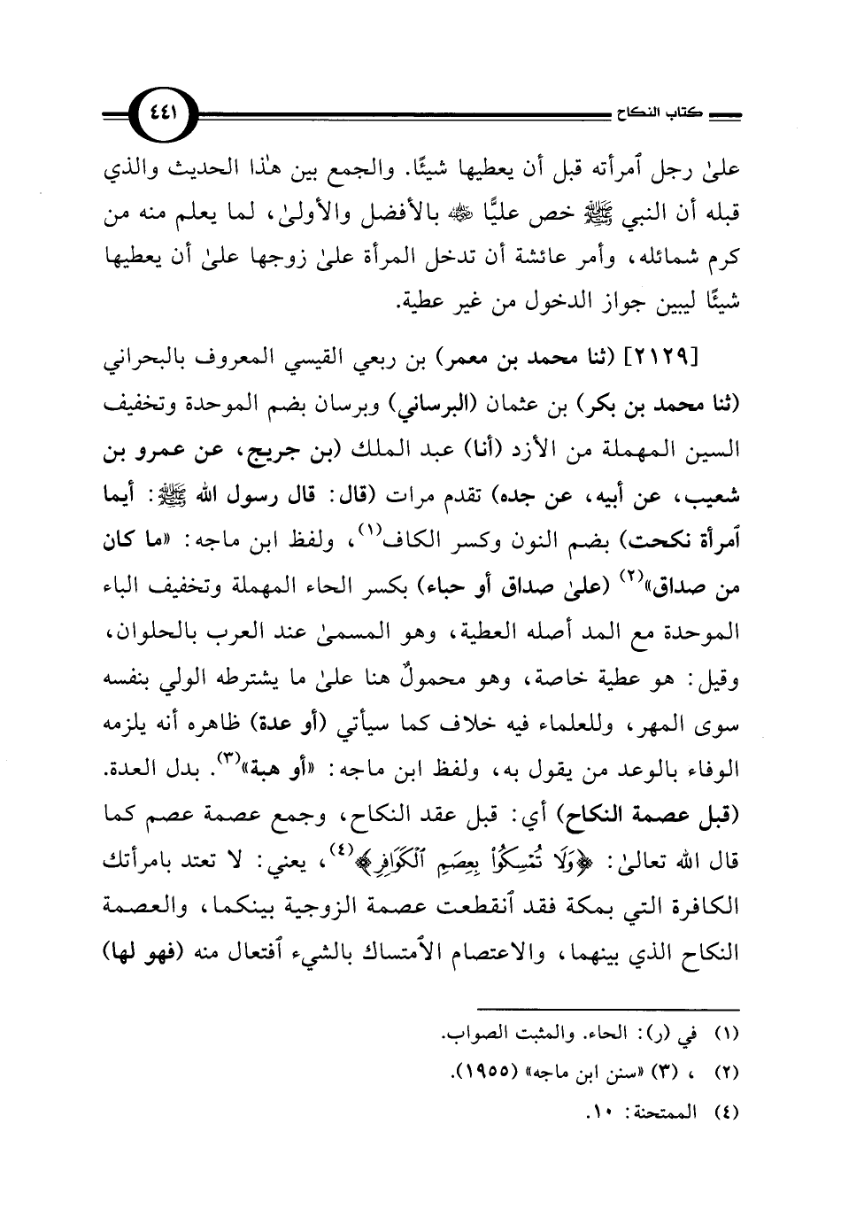 [2129] (ثنا محمد بن معمر) بن ربعي القيسي المعروف بالبحراني (ثنا محمد بن بكر) بن عثمان (البرساني) وبرسان بضم الموحدة وتخفيف السين المهملة من الأزد (أنا) عبد الملك (بن جريج، عن عمرو بن شعيب، عن أبيه، عن جده) تقدم مرات (قال: قال رسول الله - صلى الله عليه وسلم -: أيما امرأة نكحت) بضم النون وكسر الكاف (¬1)، ولفظ ابن ماجه: "ما كان من صداق" (¬2) (على صداق أو حباء) بكسر الحاء المهملة وتخفيف الباء الموحدة مع المد أصله العطية، وهو المسمى عند العرب بالحلوان، وقيل: هو عطية خاصة، وهو محمولٌ هنا على ما يشترطه الولي بنفسه سوى المهر، وللعلماء فيه خلاف كما سيأتي (أو عدة) ظاهره أنه يلزمه الوفاء بالوعد من يقول به، ولفظ ابن ماجه: "أو هبة" (¬3). بدل العدة. (قبل عصمة النكاح) أي: قبل عقد النكاح، وجمع عصمة عصم كما قال الله تعالى: {وَلَا تُمْسِكُوا بِعِصَمِ الْكَوَافِرِ} (¬4)، يعني: لا تعتد بامرأتك الكافرة التي بمكة فقد انقطعت عصمة الزوجية بينكما، والعصمة النكاح الذي بينهما، والاعتصام الامتساك بالشيء افتعال منه (فهو لها)