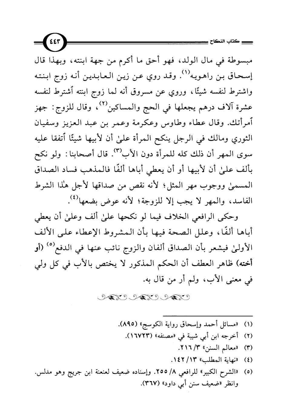 مبسوطة في مال الولد، فهو أحق ما أكرم من جهة ابنته، وبهذا قال إسحاق بن راهويه (¬1). وقد روي عن زين العابدين أنه زوج ابنته واشترط لنفسه شيئًا، وروي عن مسروق أنه لما زوج ابنته اشترط لنفسه عشرة آلاف درهم يجعلها في الحج والمساكين (¬2)، وقال للزوج: جهز امرأتك. وقال عطاء وطاوس وعكرمة وعمر بن عبد العزيز وسفيان الثوري ومالك في الرجل ينكح المرأة على أن لأبيها شيئًا اتفقا عليه سوى المهر أن ذلك كله للمرأة دون الأب (¬3). قال أصحابنا: ولو نكح بألف على أن لأبيها أو أن يعطي أباها ألفًا فالمذهب فساد الصداق المسمى ووجوب مهر المثل؛ لأنه نقص من صداقها لأجل هذا الشرط الفاسد، والمهر لا يجب إلا للزوجة؛ لأنه عوض بضعها (¬4).