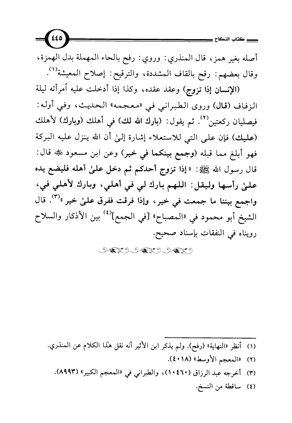 (الإنسان إذا تزوج) وعقد عقده، وكذا إذا أدخلت عليه امرأته ليلة الزفاف (قال) وروى الطبراني في "معجمه" الحديث، وفي أوله: فيصليان ركعتين (¬2). ثم يقول: (بارك الله لك) في أهلك (وبارك) لأهلك (عليك) فإن على التي للاستعلاء إشارة إلى أن الله ينزل عليه البركة فهو أبلغ مما قبله (وجمع بينكما في خير) وعن ابن مسعود - رضي الله عنه - قال: قال رسول الله - صلى الله عليه وسلم -: "إذا تزوج أحدكم ثم دخل على أهله فليضع يده على رأسها وليقل: اللهم بارك لي في أهلي، وبارك لأهلي في، واجمع بيننا ما جمعت في خير، وإذا فرقت ففرق على خير" (¬3). قال الشيخ أبو محمود في "المصباح" [في الجمع] (¬4) بين الأذكار والسلاح رويناه في النفقات بإسناد صحيح.