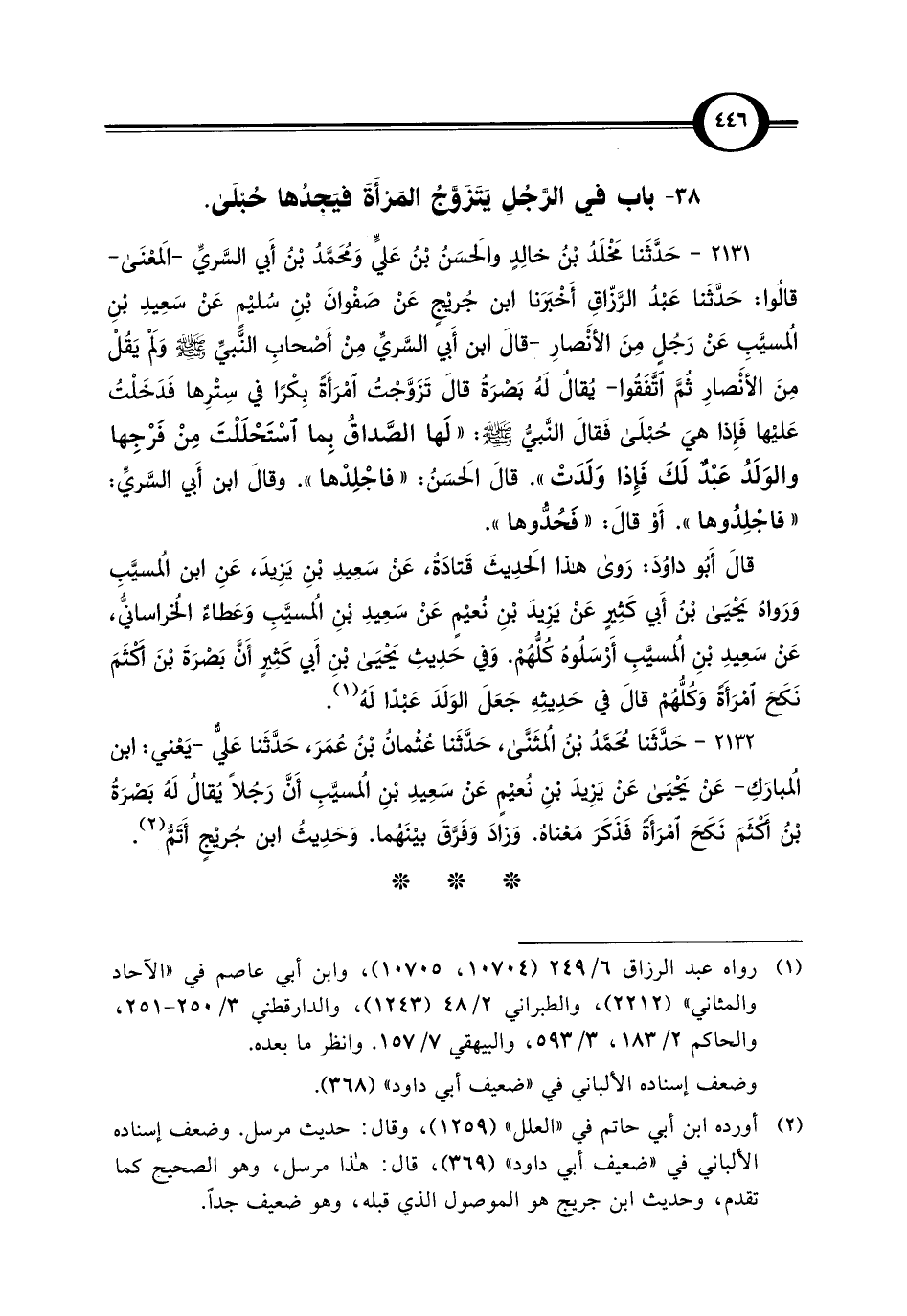 2131 - حَدَّثَنا مَخْلَدُ بْنُ خالِدٍ والحَسَنُ بْنُ عَليٍّ وَمُحَمَّدُ بْنُ أَبِي السَّريِّ - المَعْنَى - قَالُوا: حَدَّثَنا عَبْدُ الرَّزّاقِ أَخْبَرَنا ابن جُريْجٍ عَنْ صَفْوانَ بْنِ سُليْمٍ عَنْ سَعِيدِ بْنِ المُسيَّبِ عَنْ رَجُلٍ مِنَ الأَنْصارِ - قَالَ ابن أَبِي السَّريِّ مِنْ أَصْحابِ النَّبيِّ - صلى الله عليه وسلم - وَلَمْ يَقُلْ مِنَ الأَنْصارِ ثُمَّ اتَّفَقُوا - يُقالُ لَهُ بَصْرَةُ قَالَ تَزَوَّجْت امْرَأَةً بِكْرًا في سِتْرِها فَدَخَلْتُ عَليْها فَإِذا هيَ حُبْلَى فَقَالَ النَّبِيُّ - صلى الله عليه وسلم -: "لَهَا الصَّداقُ بِما اسْتَحْلَلْتَ مِنْ فَرْجِهَا والوَلَدُ عَبْدٌ لَكَ فَإِذا وَلَدَتْ". قَالَ الحَسَنُ: "فاجْلِدْها". وقَالَ ابن أَبي السَّريِّ: "فاجْلِدُوها". أَوْ قَالَ: "فَحُدُّوها".