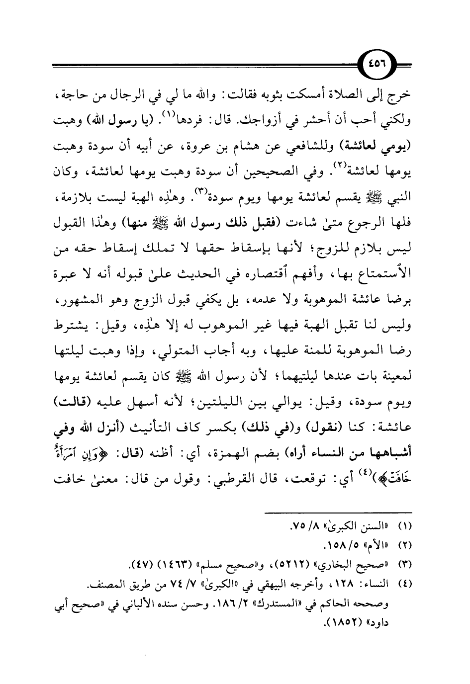 خرج إلى الصلاة أمسكت بثوبه فقالت: والله ما لي في الرجال من حاجة، ولكني أحب أن أحشر في أزواجك. قال: فردها (¬1). (يا رسول الله) وهبت (يومي لعائشة) وللشافعي عن هشام بن عروة، عن أبيه أن سودة وهبت يومها لعائشة (¬2). وفي الصحيحين أن سودة وهبت يومها لعائشة، وكان النبي - صلى الله عليه وسلم - يقسم لعائشة يومها ويوم سودة (¬3). وهذِه الهبة ليست بلازمة، فلها الرجوع متى شاءت (فقبل ذلك رسول الله - صلى الله عليه وسلم - منها) وهذا القبول ليس بلازم للزوج؛ لأنها بإسقاط حقها لا تملك إسقاط حقه من الاستمتاع بها، وأفهم اقتصاره في الحديث على قبوله أنه لا عبرة برضا عائشة الموهوبة ولا عدمه، بل يكفي قبول الزوج وهو المشهور، وليس لنا تقبل الهبة فيها غير الموهوب له إلا هذِه، وقيل: يشترط رضا الموهوبة للمنة عليها، وبه أجاب المتولي، وإذا وهبت ليلتها لمعينة بات عندها ليلتيهما؛ لأن رسول الله - صلى الله عليه وسلم - كان يقسم لعائشة يومها ويوم سودة، وقيل: يوالي بين الليلتين؛ لأنه أسهل عليه (قالت) عائشة: كنا (نقول) و (في ذلك) بكسر كاف التأنيث (أنزل الله وفي أشباهها من النساء أراه) بضم الهمزة، أي: أظنه (قال: {وَإِنِ امْرَأَةٌ خَافَتْ}) (¬4) أي: توقعت، قال القرطبي: وقول من قال: معنى خافت