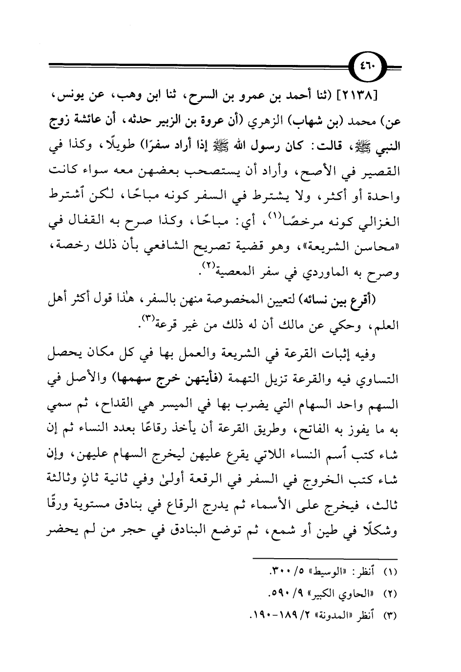 [2138] (ثنا أحمد بن عمرو بن السرح، ثنا ابن وهب، عن يونس، عن) محمد (بن شهاب) الزهري (أن عروة بن الزبير حدثه، أن عائشة زوج النبي - صلى الله عليه وسلم -، قالت: كان رسول الله - صلى الله عليه وسلم - إذا أراد سفرًا) طويلًا، وكذا في القصير في الأصح، وأراد أن يستصحب بعضهن معه سواء كانت واحدة أو أكثر، ولا يشترط في السفر كونه مباحًا، لكن اشترط الغزالي كونه مرخصًا (¬1)، أي: مباحًا، وكذا صرح به القفال في "محاسن الشريعة"، وهو قضية تصريح الشافعي بأن ذلك رخصة، وصرح به الماوردي في سفر المعصية (¬2).