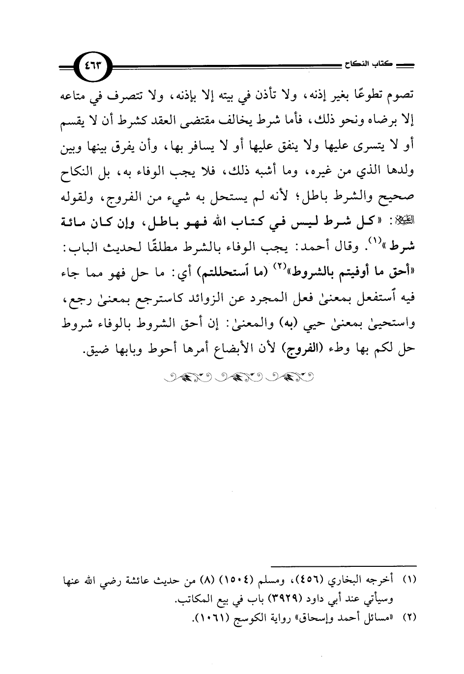 تصوم تطوعًا بغير إذنه، ولا تأذن في بيته إلا بإذنه، ولا تتصرف في متاعه إلا برضاه ونحو ذلك، فأما شرط يخالف مقتضى العقد كشرط أن لا يقسم أو لا يتسرى عليها ولا ينفق عليها أو لا يسافر بها، وأن يفرق بينها وبين ولدها الذي من غيره، وما أشبه ذلك، فلا يجب الوفاء به، بل النكاح صحيح والشرط باطل؛ لأنه لم يستحل به شيء من الفروج، ولقوله - عليه السلام -: "كل شرط ليس في كتاب الله فهو باطل، وإن كان مائة شرط" (¬1). وقال أحمد: يجب الوفاء بالشرط مطلقًا لحديث الباب: "أحق ما أوفيتم بالشروط" (¬2) (ما استحللتم) أي: ما حل فهو مما جاء فيه استفعل بمعنى فعل المجرد عن الزوائد كاسترجع بمعنى رجع، واستحيى بمعنى حيي (به) والمعنى: إن أحق الشروط بالوفاء شروط حل لكم بها وطء (الفروج) لأن الأبضاع أمرها أحوط وبابها ضيق.