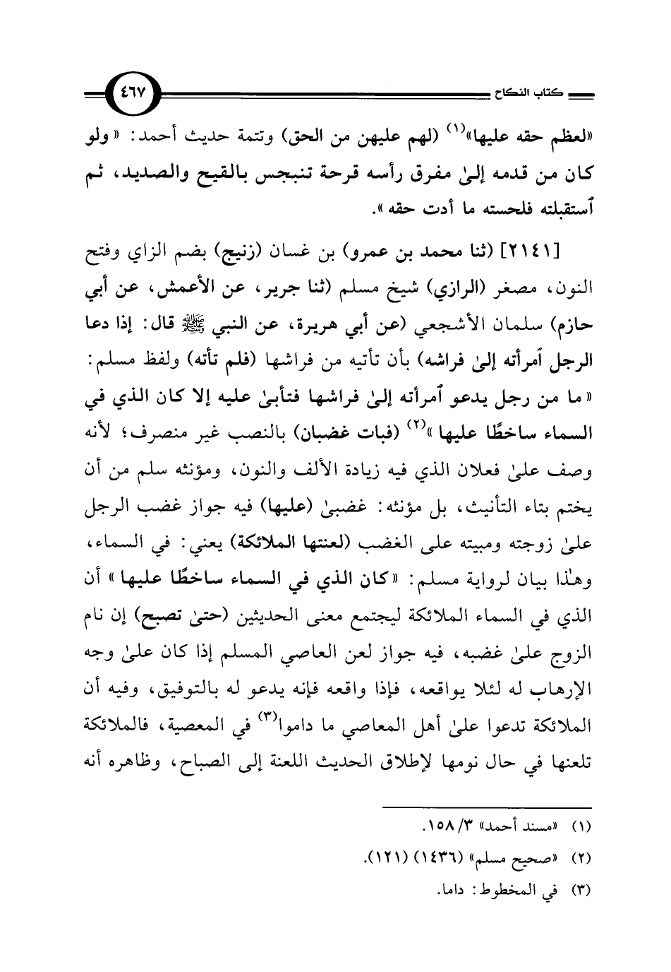 [2141] (ثنا محمد بن عمرو) بن غسان (زنيج) بضم الزاي وفتح النون، مصغر (الرازي) شيخ مسلم (ثنا جرير، عن الأعمش، عن أبي حازم) سلمان الأشجعي (عن أبي هريرة، عن النبي - صلى الله عليه وسلم - قال: إذا دعا الرجل امرأته إلى فراشه) بأن تأتيه من فراشها (فلم تأته) ولفظ مسلم: "ما من رجل يدعو امرأته إلى فراشها فتأبى عليه إلا كان الذي في السماء ساخطًا عليها" (¬2) (فبات غضبان) بالنصب غير منصرف؛ لأنه وصف على فعلان الذي فيه زيادة الألف والنون، ومؤنثه سلم من أن يختم بتاء التأنيث، بل مؤنثه: غضبى (عليها) فيه جواز غضب الرجل على زوجته ومبيته على الغضب (لعنتها الملائكة) يعني: في السماء، وهذا بيان لرواية مسلم: "كان الذي في السماء ساخطًا عليها" أن الذي في السماء الملائكة ليجتمع معنى الحديثين (حتى تصبح) إن نام الزوج على غضبه، فيه جواز لعن العاصي المسلم إذا كان على وجه الإرهاب له لئلا يواقعه، فإذا واقعه فإنه يدعو له بالتوفيق، وفيه أن الملائكة تدعوا على أهل المعاصي ما داموا (¬3) في المعصية، فالملائكة تلعنها في حال نومها لإطلاق الحديث اللعنة إلى الصباح، وظاهره أنه