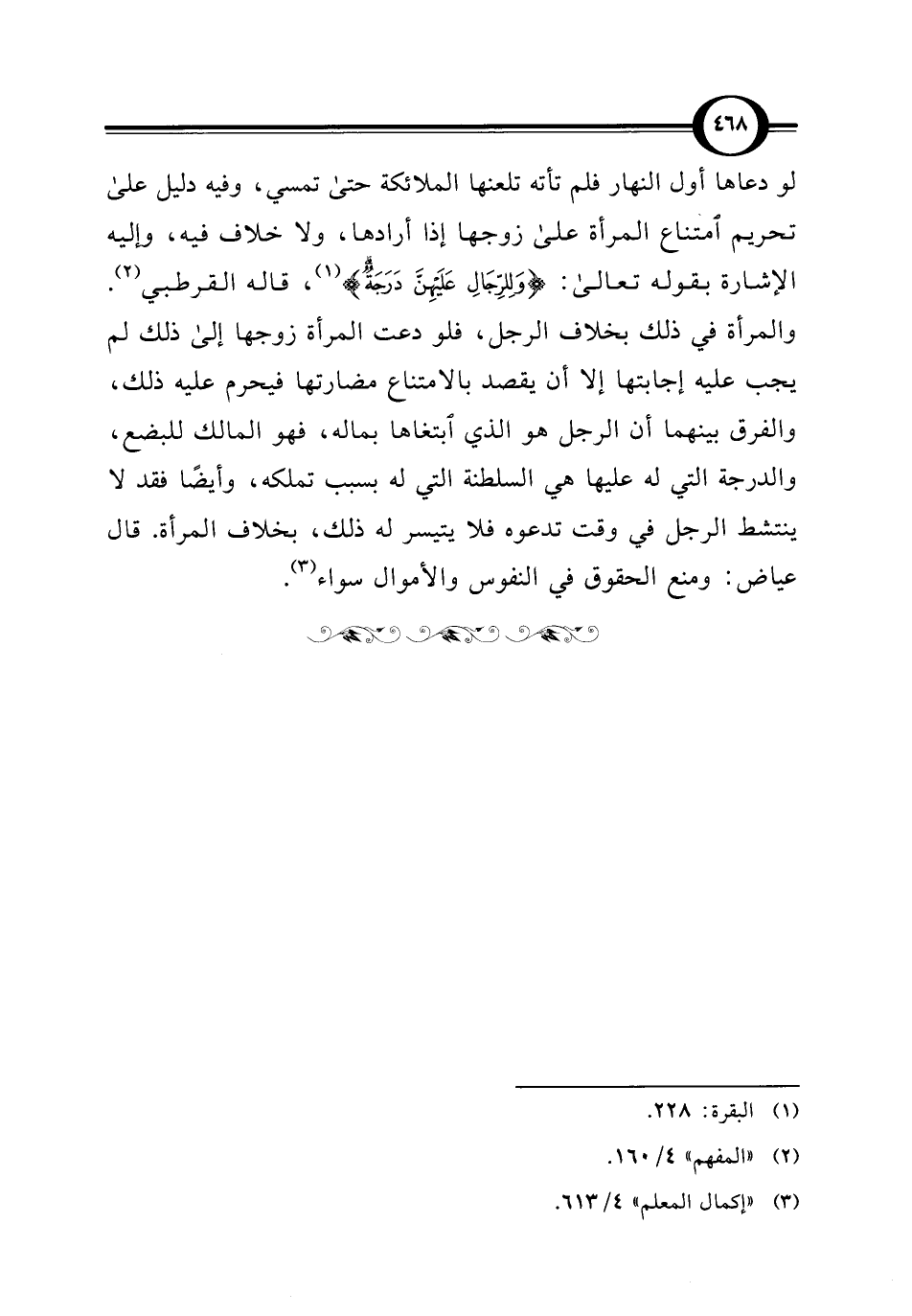 لو دعاها أول النهار فلم تأته تلعنها الملائكة حتى تمسي، وفيه دليل على تحريم امتناع المرأة على زوجها إذا أرادها، ولا خلاف فيه، وإليه الإشارة بقوله تعالى: {وَلِلرِّجَالِ عَلَيْهِنَّ دَرَجَةٌ} (¬1)، قاله القرطبي (¬2). والمرأة في ذلك بخلاف الرجل، فلو دعت المرأة زوجها إلى ذلك لم يجب عليه إجابتها إلا أن يقصد بالامتناع مضارتها فيحرم عليه ذلك، والفرق بينهما أن الرجل هو الذي ابتغاها بماله، فهو المالك للبضع، والدرجة التي له عليها هي السلطنة التي له بسبب تملكه، وأيضًا فقد لا ينتشط الرجل في وقت تدعوه فلا يتيسر له ذلك، بخلاف المرأة. قال عياض: ومنع الحقوق في النفوس والأموال سواء (¬3).