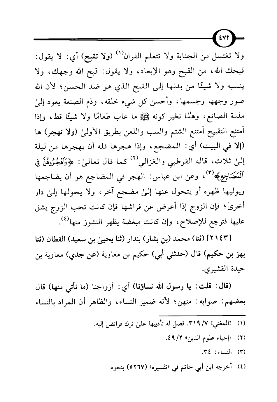ولا تغتسل من الجنابة ولا تتعلم القرآن (¬1) (ولا تقبح) أي: لا يقول: قبحك الله، من القبح وهو الإبعاد، ولا يقول: قبح الله وجهك، ولا ينسبه ولا شيئًا من بدنها إلى القبح الذي هو ضد الحسن؛ لأن الله صور وجهها وجسمها، وأحسن كل شيء خلقه، وذم الصنعة يعود إلى مذمة الصانع، وهذا نظير كونه - صلى الله عليه وسلم - ما عاب طعامًا ولا شيئًا قط، وإذا امتنع التقبيح امتنع الشتم والسب واللعن بطريق الأولى (ولا تهجر) ها (إلا في البيت) أي: المضجع، وإذا هجرها فله أن يهجرها من ليلة إلى ثلاث، قاله القرطبي والغزالي (¬2) كما قال تعالى: {وَاهْجُرُوهُنَّ فِي الْمَضَاجِعِ} (¬3)، وعن ابن عباس: الهجر في المضاجع هو أن يضاجعها ويوليها ظهره أو يتحول عنها إلى مضجع آخر، ولا يحولها إلى دار أخرى؛ فإن الزوج إذا أعرض عن فراشها فإن كانت تحب الزوج يشق عليها فترجع للإصلاح، وإن كانت مبغضة يظهر النشوز منها (¬4).