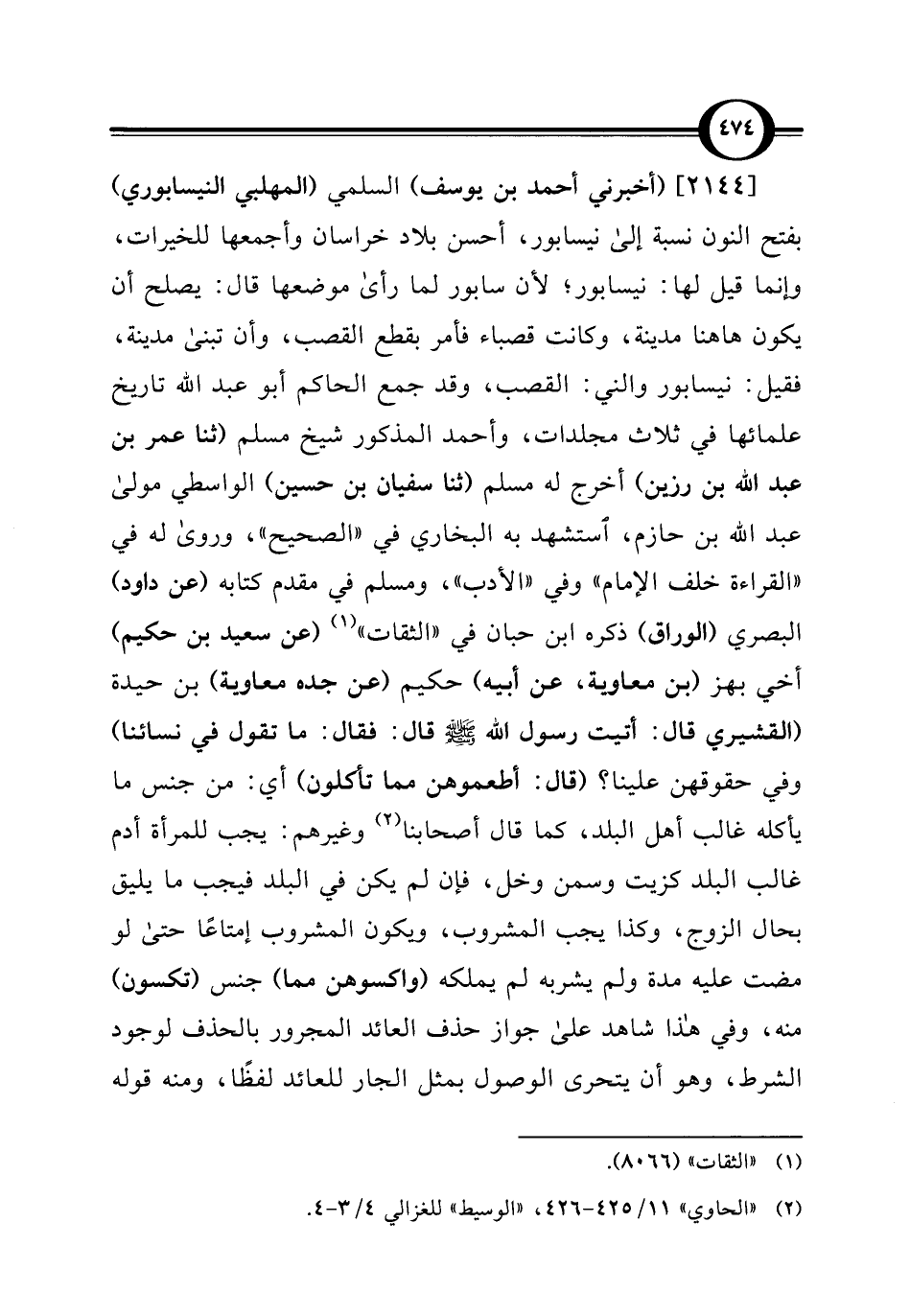 [2144] (أخبرني أحمد بن يوسف) السلمي (المهلبي النيسابوري) بفتح النون نسبة إلى نيسابور، أحسن بلاد خراسان وأجمعها للخيرات، وإنما قيل لها: نيسابور؛ لأن سابور لما رأى موضعها قال: يصلح أن يكون ها هنا مدينة، وكانت قصباء فأمر بقطع القصب، وأن تبنى مدينة، فقيل: نيسابور والني: القصب، وقد جمع الحاكم أبو عبد الله تاريخ علمائها في ثلاث مجلدات، وأحمد المذكور شيخ مسلم (ثنا عمر بن عبد الله بن رزين) أخرج له مسلم (ثنا سفيان بن حسين) الواسطي مولى عبد الله بن حازم، استشهد به البخاري في "الصحيح"، وروى له في "القراءة خلف الإمام" وفي "الأدب"، ومسلم في مقدم كتابه (عن داود) البصري (الوراق) ذكره ابن حبان في "الثقات" (¬1) (عن سعيد بن حكيم) أخي بهز (بن معاوية، عن أبيه) حكيم (عن جده معاوية) بن حيدة (القشيري قال: أتيت رسول الله - صلى الله عليه وسلم - قال: فقال: ما تقول في نسائنا) وفي حقوقهن علينا؟ (قال: أطعموهن مما تأكلون) أي: من جنس ما يأكله غالب أهل البلد، كما قال أصحابنا (¬2) وغيرهم: يجب للمرأة أدم غالب البلد كزيت وسمن وخل، فإن لم يكن في البلد فيجب ما يليق بحال الزوج، وكذا يجب المشروب، ويكون المشروب إمتاعًا حتى لو مضت عليه مدة ولم يشربه لم يملكه (واكسوهن مما) جنس (تكسون) منه، وفي هذا شاهد على جواز حذف العائد المجرور بالحذف لوجود الشرط، وهو أن يتحرى الوصول بمثل الجار للعائد لفظًا، ومنه قوله