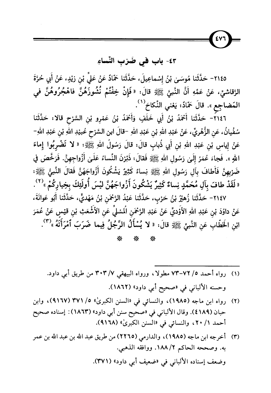 2147 - حَدَّثَنا زُهيْرُ بْنُ حَرْبٍ، حَدَّثَنا عَبْدُ الرَّحْمَنِ بْنُ مَهْديٍّ، حَدَّثَنا أَبُو عَوانَةَ، عَنْ دَاوُدَ بْنِ عَبْدِ اللهِ الأَوْديِّ عَنْ عَبْدِ الرَّحْمَنِ المُسْليِّ عَنِ الأَشْعَثِ بْنِ قَيْسٍ عَنْ عُمَرَ بْنِ الخَطَّابِ عَنِ النَّبيِّ - صلى الله عليه وسلم - قَالَ: "لا يُسْأَلُ الرَّجُلُ فِيما ضَرَبَ امْرَأَتَهُ" (¬3).