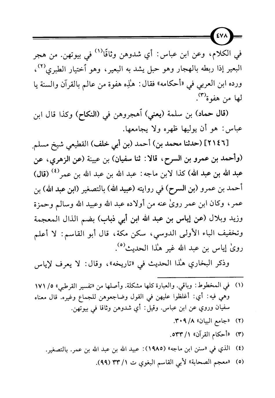 [2146] (حدثنا محمد بن) أحمد (بن أبي خلف) القطيعي شيخ مسلم. (وأحمد بن عمرو بن السرح، قالا: ثنا سفيان) بن عيينة (عن الزهري، عن عبد الله بن عبد الله) كذا لابن ماجه: عبد الله بن عبد الله بن عمر (¬4) (قال) أحمد بن عمرو (بن السرح) في روايته (عبيد الله) بالتصغير (ابن عبد الله) بن عمر، وكان ابن عمر روى عنه من أولاده عبد الله وعبيد الله وسالم وحمزة وزيد وبلال (عن إياس بن عبد الله بن أبي ذباب) بضم الذال المعجمة وتخفيف الباء الأولى الدوسي، سكن مكة، قال أبو القاسم: لا أعلم روى إياس بن عبد الله غير هذا الحديث (¬5).