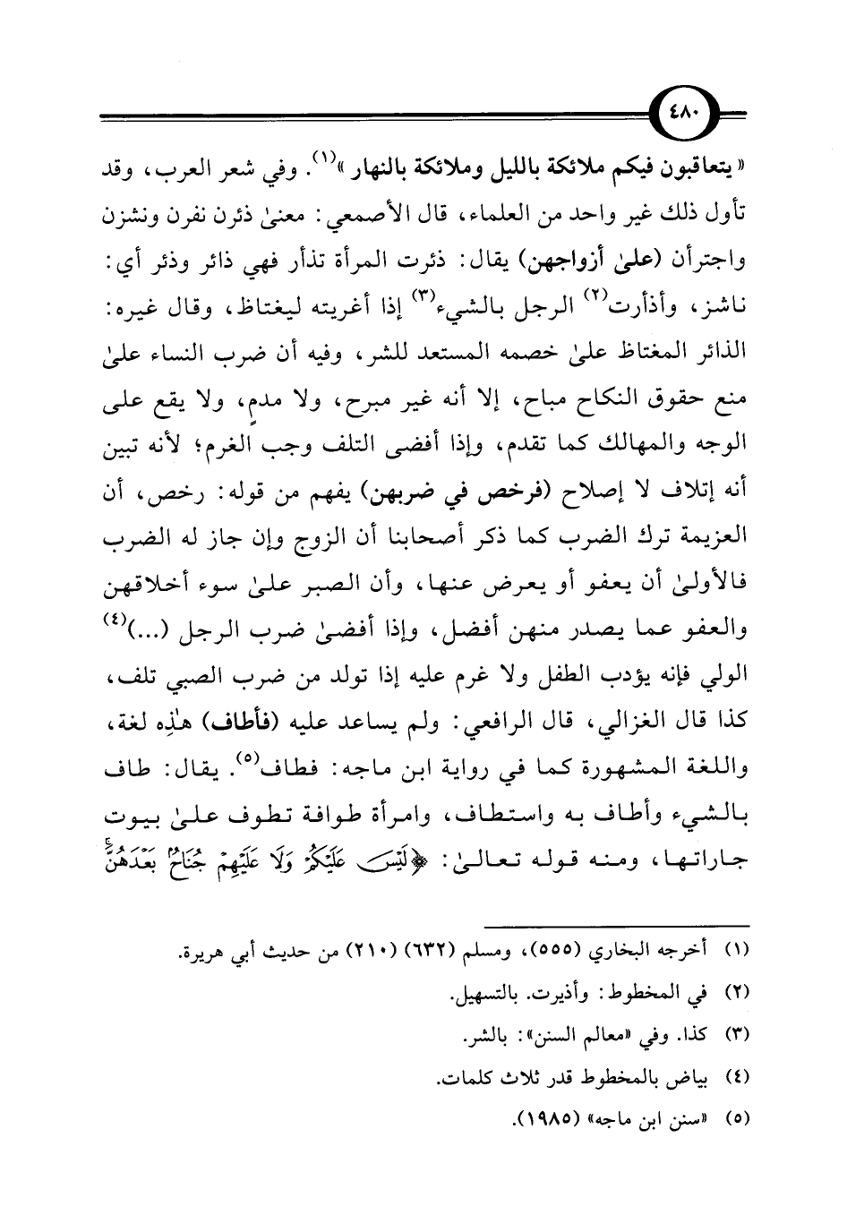 "يتعاقبون فيكم ملائكة بالليل وملائكة بالنهار" (¬1). وفي شعر العرب، وقد تأول ذلك غير واحد من العلماء، قال الأصمعي: معنى ذئرن نفرن ونشزن واجترأن (على أزواجهن) يقال: ذئرت المرأة تذأر فهي ذائر وذئر أي: ناشز، وأذأرت (¬2) الرجل بالشيء (¬3) إذا أغريته ليغتاظ، وقال غيره: الذائر المغتاظ على خصمه المستعد للشر، وفيه أن ضرب النساء على منع حقوق النكاح مباح، إلا أنه غير مبرح، ولا مدمٍ، ولا يقع على الوجه والمهالك كما تقدم، وإذا أفضى التلف وجب الغرم؛ لأنه تبين أنه إتلاف لا إصلاح (فرخص في ضربهن) يفهم من قوله: رخص، أن العزيمة ترك الضرب كما ذكر أصحابنا أن الزوج وإن جاز له الضرب فالأولى أن يعفو أو يعرض عنها، وأن الصبر على سوء أخلاقهن والعفو عما يصدر منهن أفضل، وإذا أفضى ضرب الرجل (. . .) (¬4) الولي فإنه يؤدب الطفل ولا غرم عليه إذا تولد من ضرب الصبي تلف، كذا قال الغزالي، قال الرافعي: ولم يساعد عليه (فأطاف) هذِه لغة، واللغة المشهورة كما في رواية ابن ماجه: فطاف (¬5). يقال: طاف بالشيء وأطاف به واستطاف، وامرأة طوافة تطوف على بيوت جاراتها، ومنه قوله تعالى: {لَيْسَ عَلَيْكُمْ وَلَا عَلَيْهِمْ جُنَاحٌ بَعْدَهُنَّ