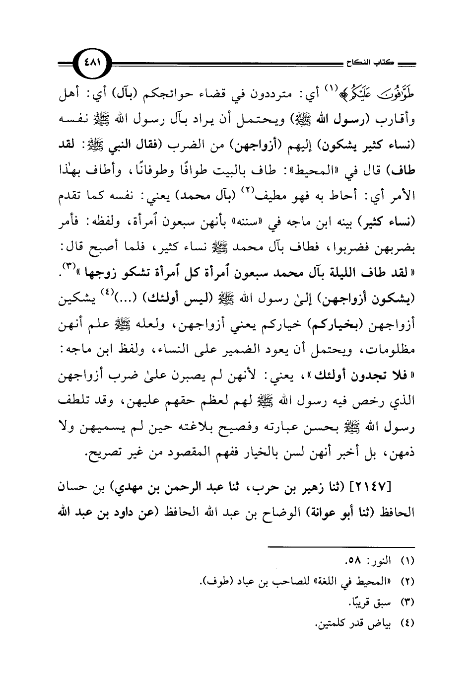 طَوَّافُونَ عَلَيْكُمْ} (¬1) أي: مترددون في قضاء حوائجكم (بآل) أي: أهل وأقارب (رسول الله - صلى الله عليه وسلم -) ويحتمل أن يراد بآل رسول الله - صلى الله عليه وسلم - نفسه (نساء كثير يشكون) إليهم (أزواجهن) من الضرب (فقال النبي - صلى الله عليه وسلم -: لقد طاف) قال في "المحيط": طاف بالبيت طوافًا وطوفانًا، وأطاف بهذا الأمر أي: أحاط به فهو مطيف (¬2) (بآل محمد) يعني: نفسه كما تقدم (نساء كثير) بينه ابن ماجه في "سننه" بأنهن سبعون امرأة، ولفظه: فأمر بضربهن فضربوا، فطاف بآل محمد - صلى الله عليه وسلم - نساء كثير، فلما أصبح قال: "لقد طاف الليلة بآل محمد سبعون امرأة كل امرأة تشكو زوجها" (¬3). (يشكون أزواجهن) إلى رسول الله - صلى الله عليه وسلم - (ليس أولئك) (. . .) (¬4) يشكين أزواجهن (بخياركم) خياركم يعني أزواجهن، ولعله - صلى الله عليه وسلم - علم أنهن مظلومات، ويحتمل أن يعود الضمير على النساء، ولفظ ابن ماجه: "فلا تجدون أولئك"، يعني: لأنهن لم يصبرن على ضرب أزواجهن الذي رخص فيه رسول الله - صلى الله عليه وسلم - لهم لعظم حقهم عليهن، وقد تلطف رسول الله - صلى الله عليه وسلم - بحسن عبارته وفصيح بلاغته حين لم يسميهن ولا ذمهن، بل أخبر أنهن لسن بالخيار ففهم المقصود من غير تصريح.