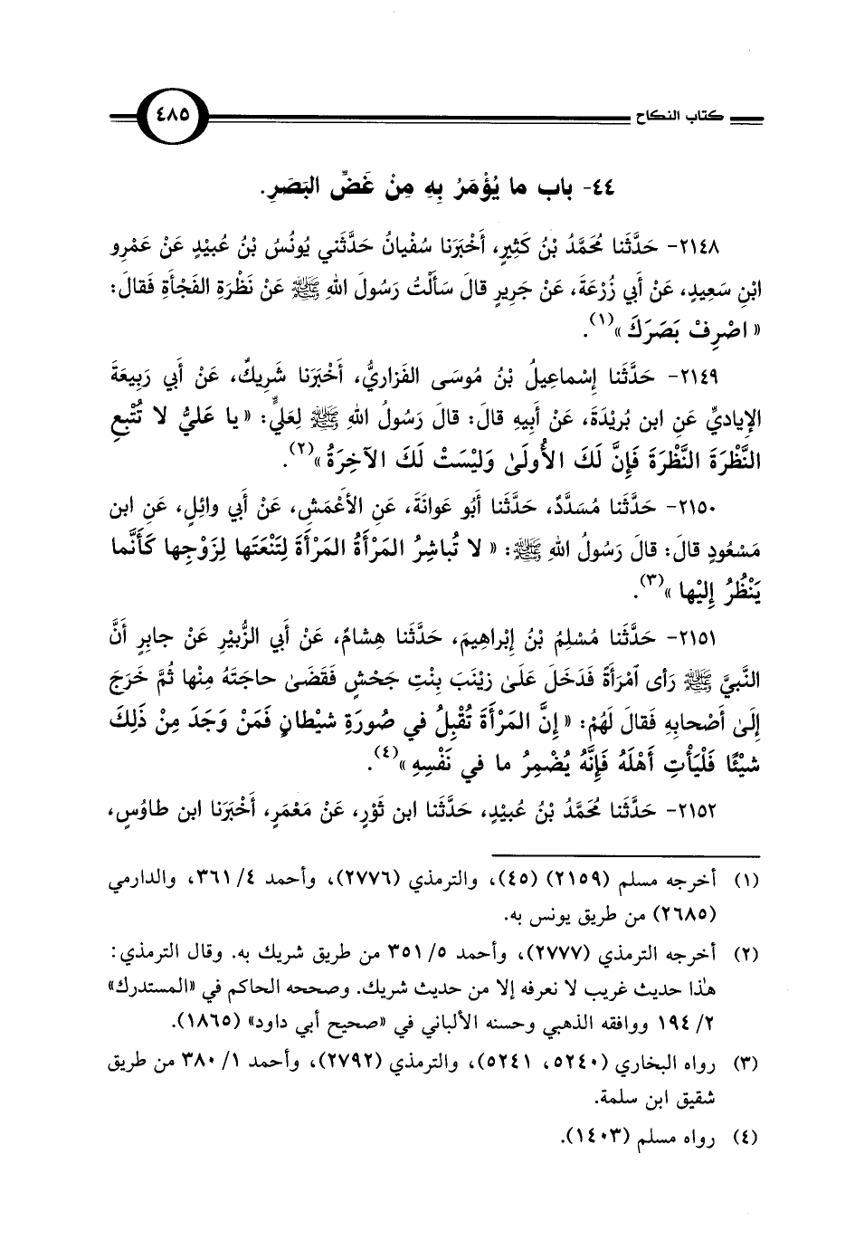 2148 - حَدَّثَنا مُحَمَّدُ بْنُ كَثِيرٍ، أَخْبَرَنا سُفْيانُ حَدَّثَنِي يُونُسُ بْنُ عُبيْدٍ عَنْ عَمْرِو بْنِ سَعِيدٍ، عَنْ أَبي زُرْعَةَ، عَنْ جَرِيرٍ قَالَ سَأَلْتُ رَسُولَ اللهِ - صلى الله عليه وسلم - عَنْ نَظْرَةِ الفَجْأَةِ فَقَالَ: "اصْرِفْ بَصَرَكَ" (¬1).