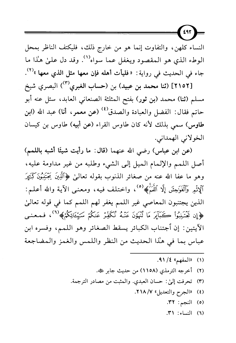 (عن ابن عباس) رضي الله عنهما (قال: ما رأيت شيئًا أشبه باللمم) أصل اللمم والإلمام الميل إلى الشيء وطلبه من غير مداومة عليه، وهو ما عفا الله عنه من صغائر الذنوب بقوله تعالى {الَّذِينَ يَجْتَنِبُونَ كَبَائِرَ الْإِثْمِ وَالْفَوَاحِشَ إِلَّا اللَّمَمَ} (¬5)، واختلف فيه، ومعنى الآية والله أعلم: الذين يجتنبون المعاصي غير اللمم يغفر لهم اللمم كما في قوله تعالى {إِنْ تَجْتَنِبُوا كَبَائِرَ مَا تُنْهَوْنَ عَنْهُ نُكَفِّرْ عَنْكُمْ سَيِّئَاتِكُمْ} (¬6)، فمعنى الآيتين: إن اجتناب الكبائر يسقط الصغائر وهو اللمم، وفسره ابن عباس بما في هذا الحديث من النظر واللمس والغمز والمضاجعة