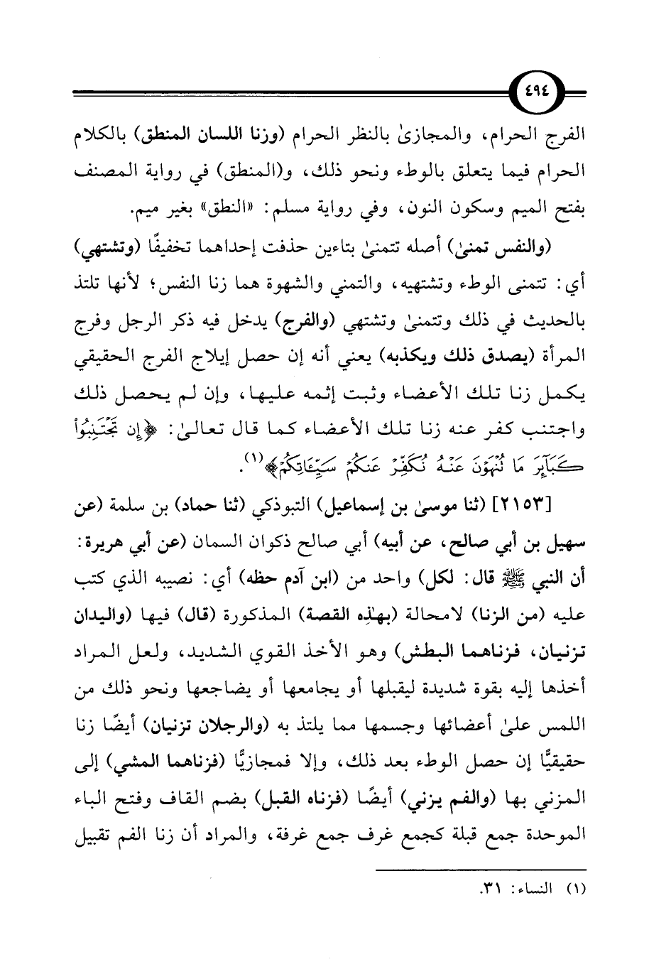 (والنفس تمنى) أصله تتمنى بتاءين حذفت إحداهما تخفيفًا (وتشتهي) أي: تتمنى الوطء وتشتهيه، والتمني والشهوة هما زنا النفس؛ لأنها تلتذ بالحديث في ذلك وتتمنى وتشتهي (والفرج) يدخل فيه ذكر الرجل وفرج المرأة (يصدق ذلك ويكذبه) يعني أنه إن حصل إيلاج الفرج الحقيقي يكمل زنا تلك الأعضاء وثبت إثمه عليها، وإن لم يحصل ذلك واجتنب كفر عنه زنا تلك الأعضاء كما قال تعالى: {إِنْ تَجْتَنِبُوا كَبَائِرَ مَا تُنْهَوْنَ عَنْهُ نُكَفِّرْ عَنْكُمْ سَيِّئَاتِكُمْ} (¬1).